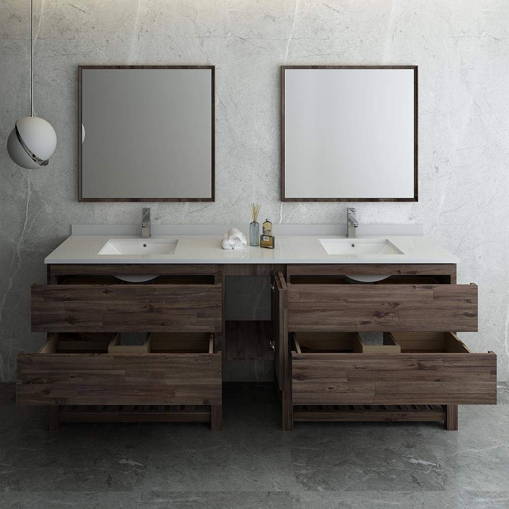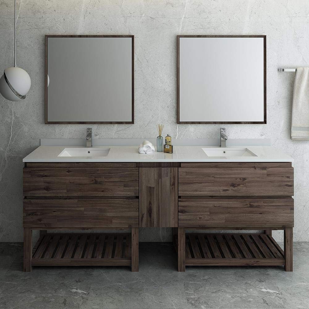 - Materials: Solid acacia wood construction, quartz stone countertop, ceramic undermount sinks with overflow