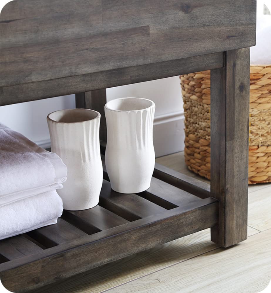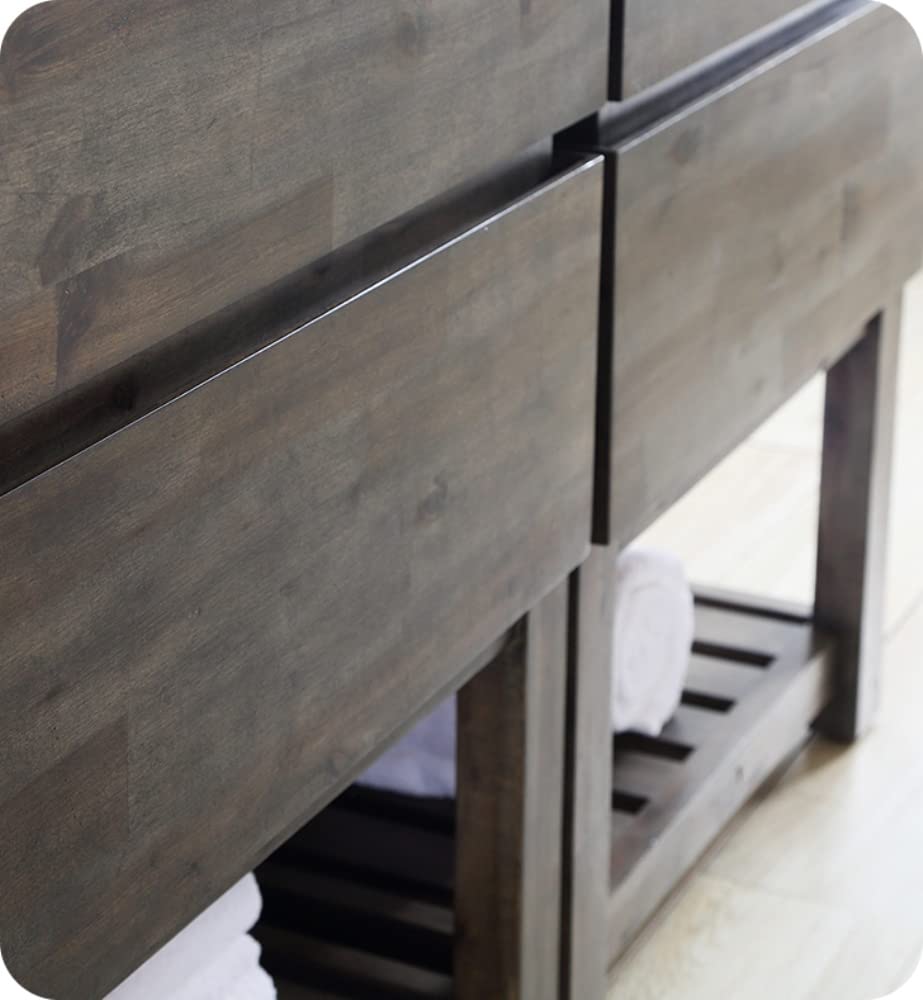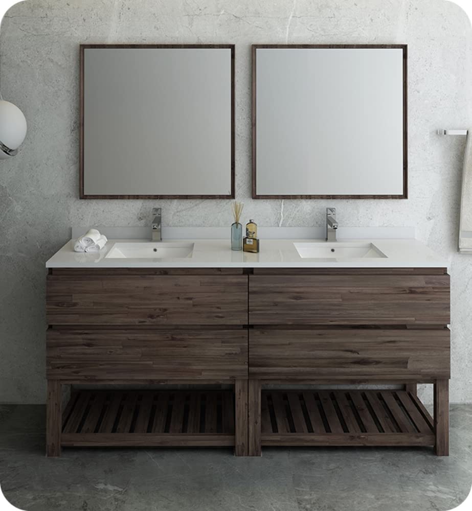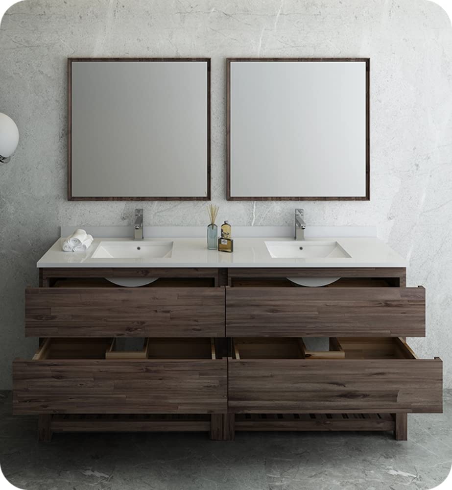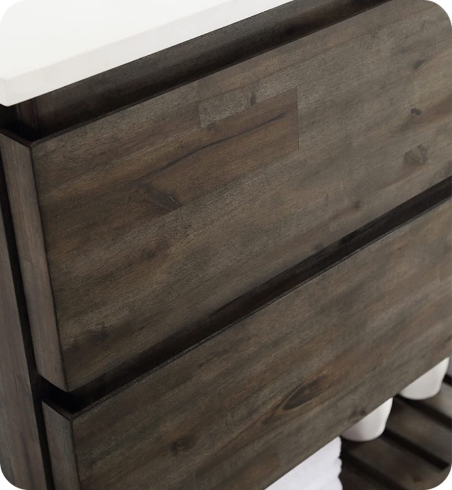 - Materials: Solid acacia wood construction, quartz stone countertop, ceramic undermount sinks with overflow