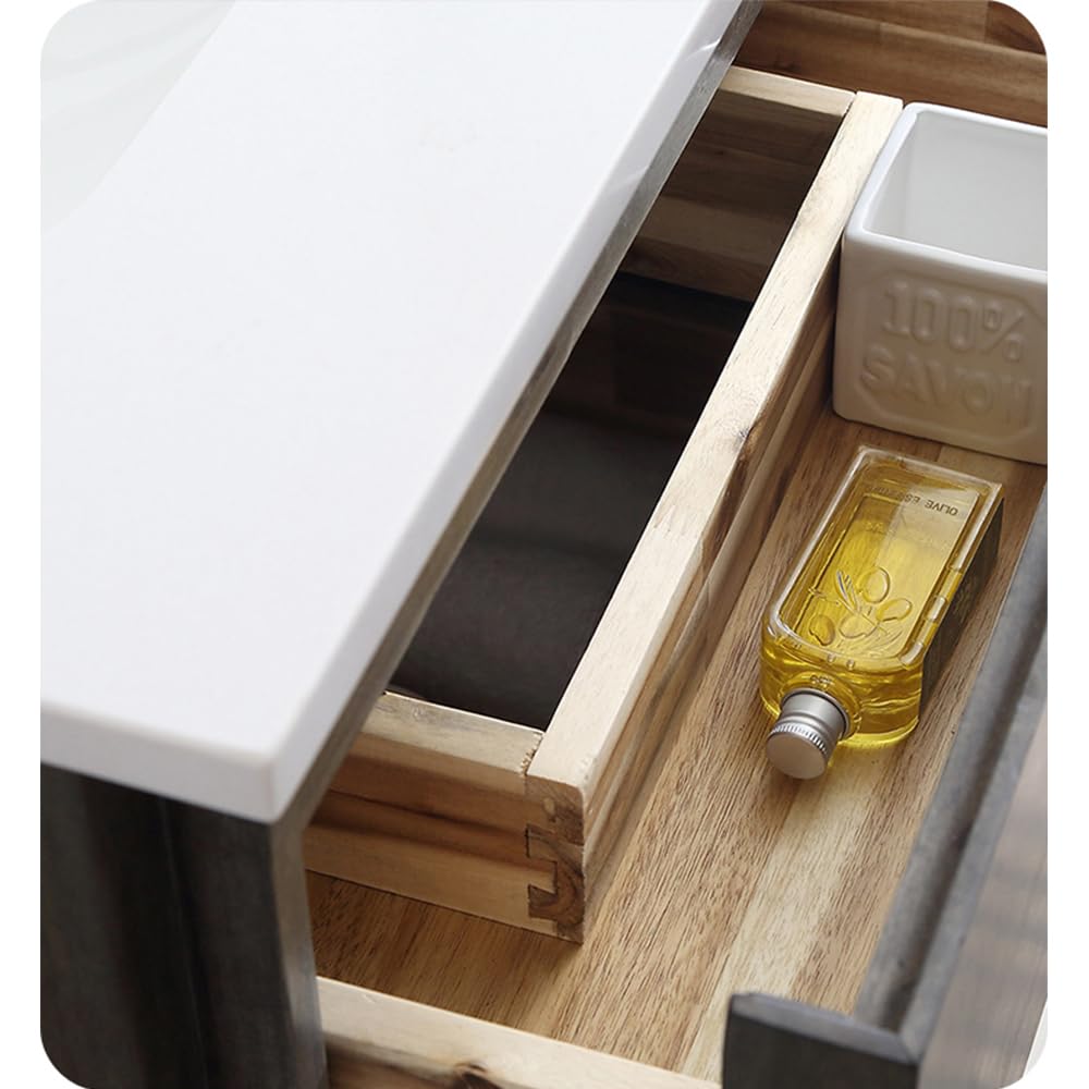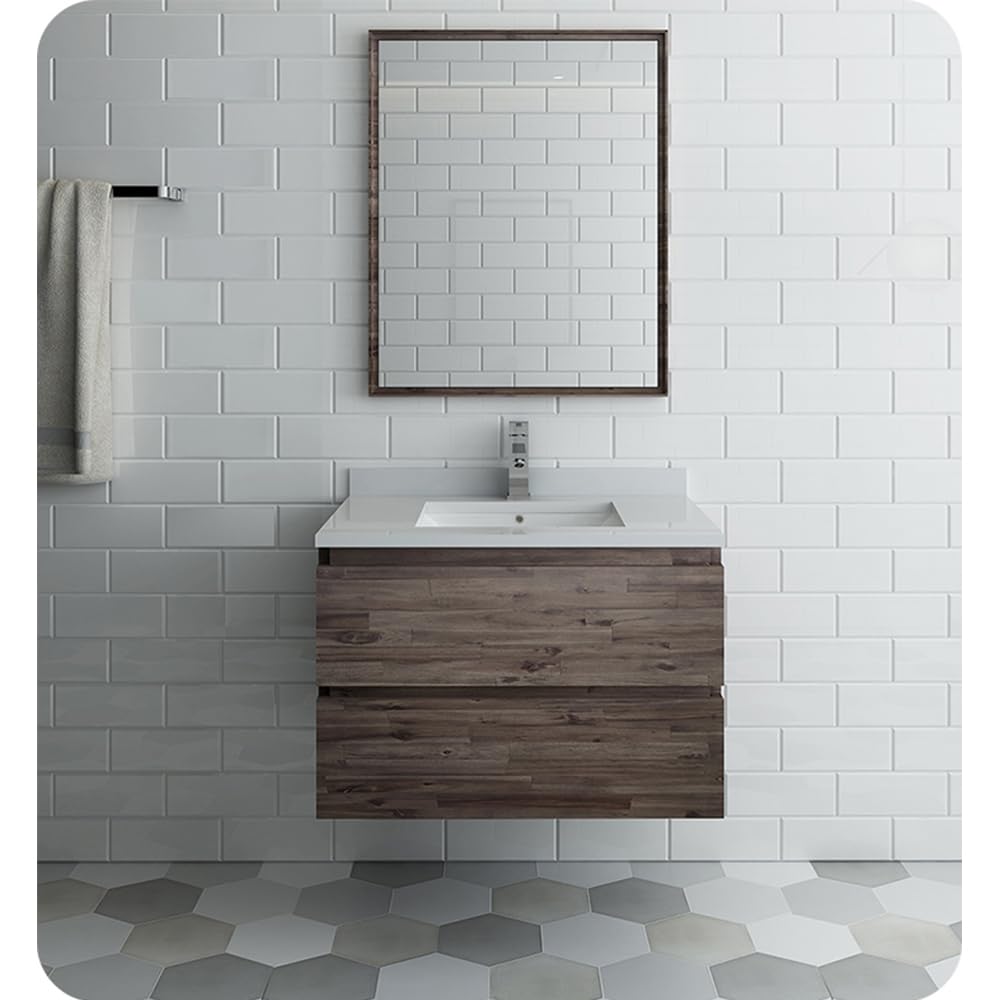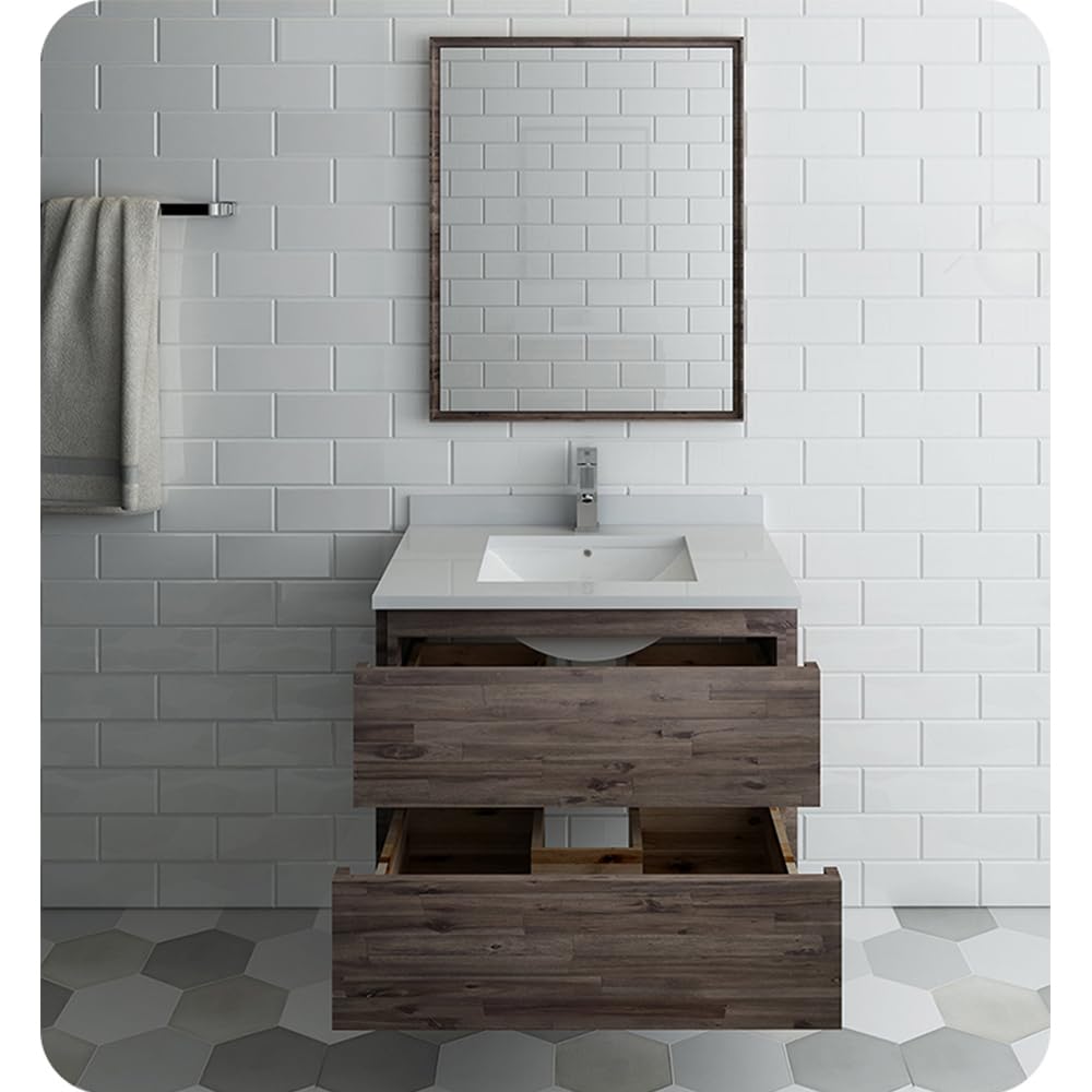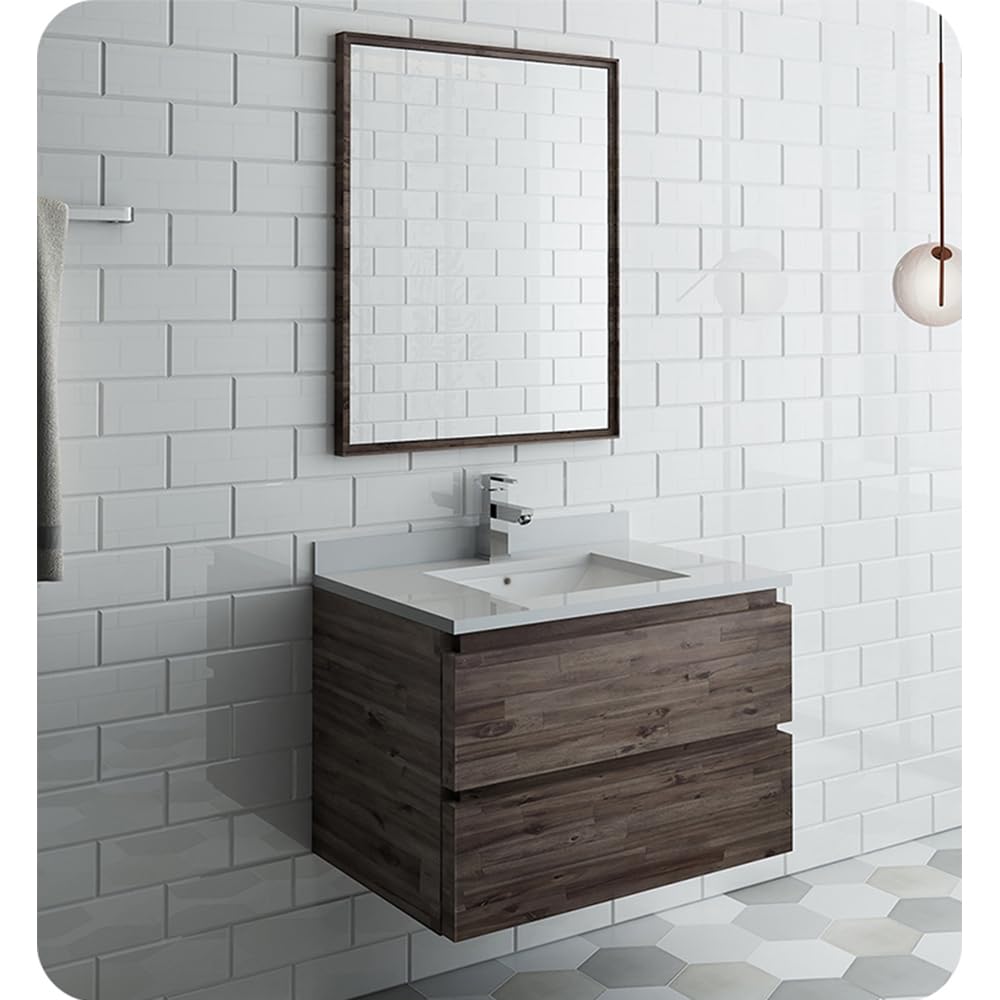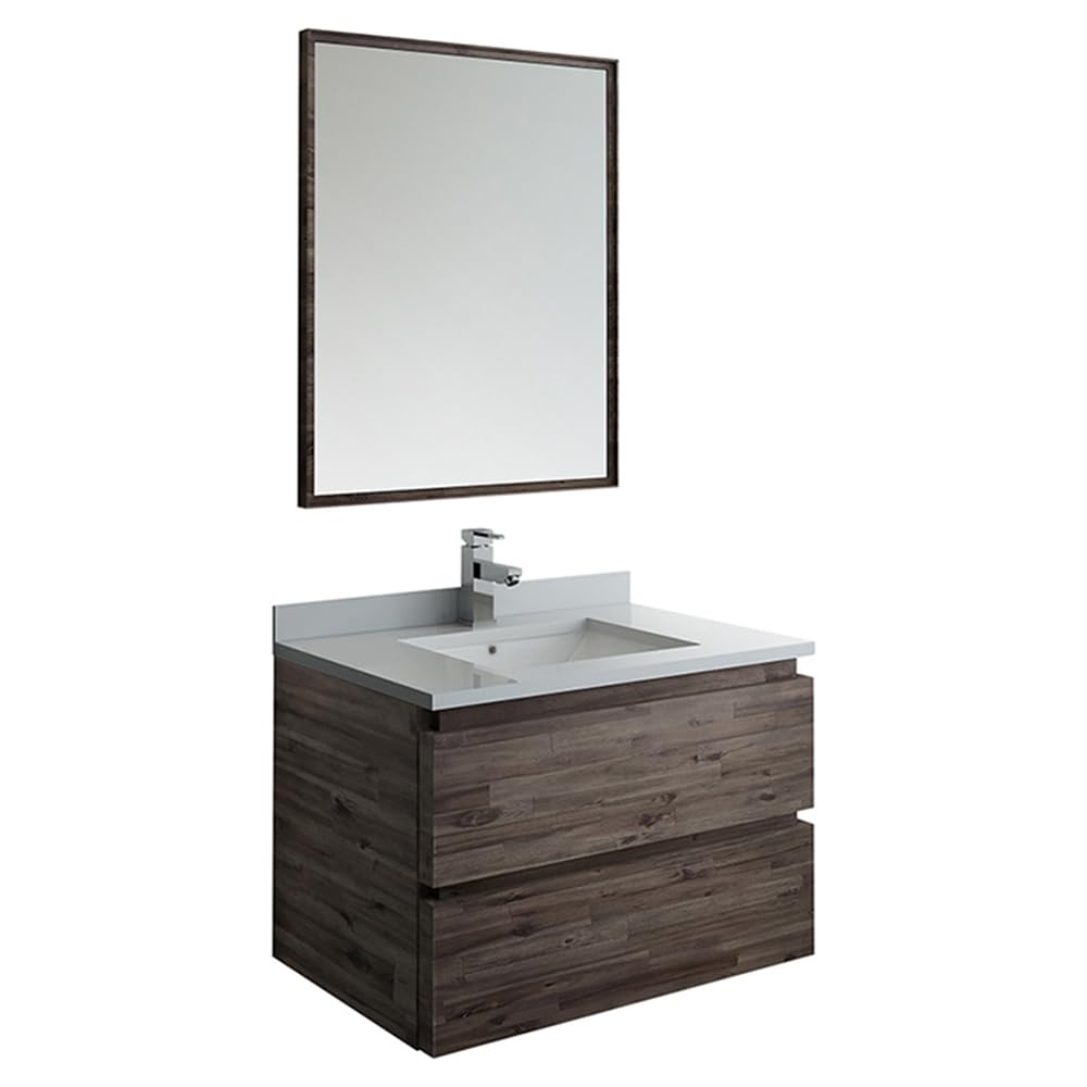 The Fresca Formosa Wall Mount Bathroom Vanity is superbly crafted of solid Acacia wood, known for its magnificent beauty and durability. It has a warm grey finish with a hint of brown throughout, and a natural grain that will inject luxurious warmth into any space. A masterpiece of elegance and style, this wall-mounted vanity measures 30 in width. Two solid wood, soft-closing dovetail drawers are perfect for organizing all of your daily essentials. The solid pine drawers are clear coated and feature a mitered, wrap-around design that adds to the superior detailing. Cove routed pulls are carved directly into the drawers keeping the design sharp and sophisticated. Gracing the top of the vanity is a stunning 30 quartz stone countertop and ceramic undermount basin. The white ceramic basin is equipped with an overflow and the countertop has been pre-drilled to accommodate the faucet of your choice. A p-trap, pop-up drain and installation hardware are included. This Formosa Wall Mount Bathroom Vanity comes with a matching 26 Acacia Mirror with a frame that is cove routed and mitered, providing the perfect finishing touch.