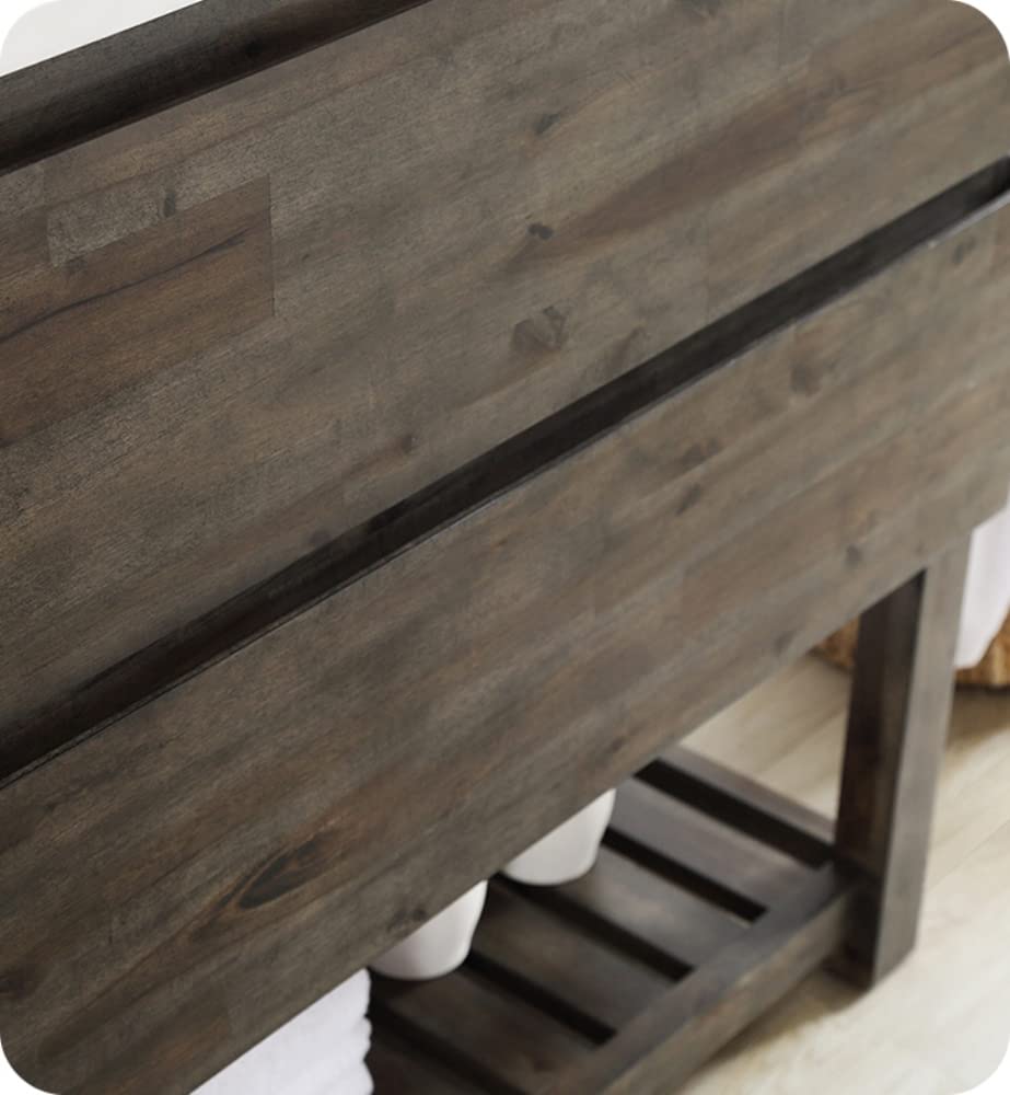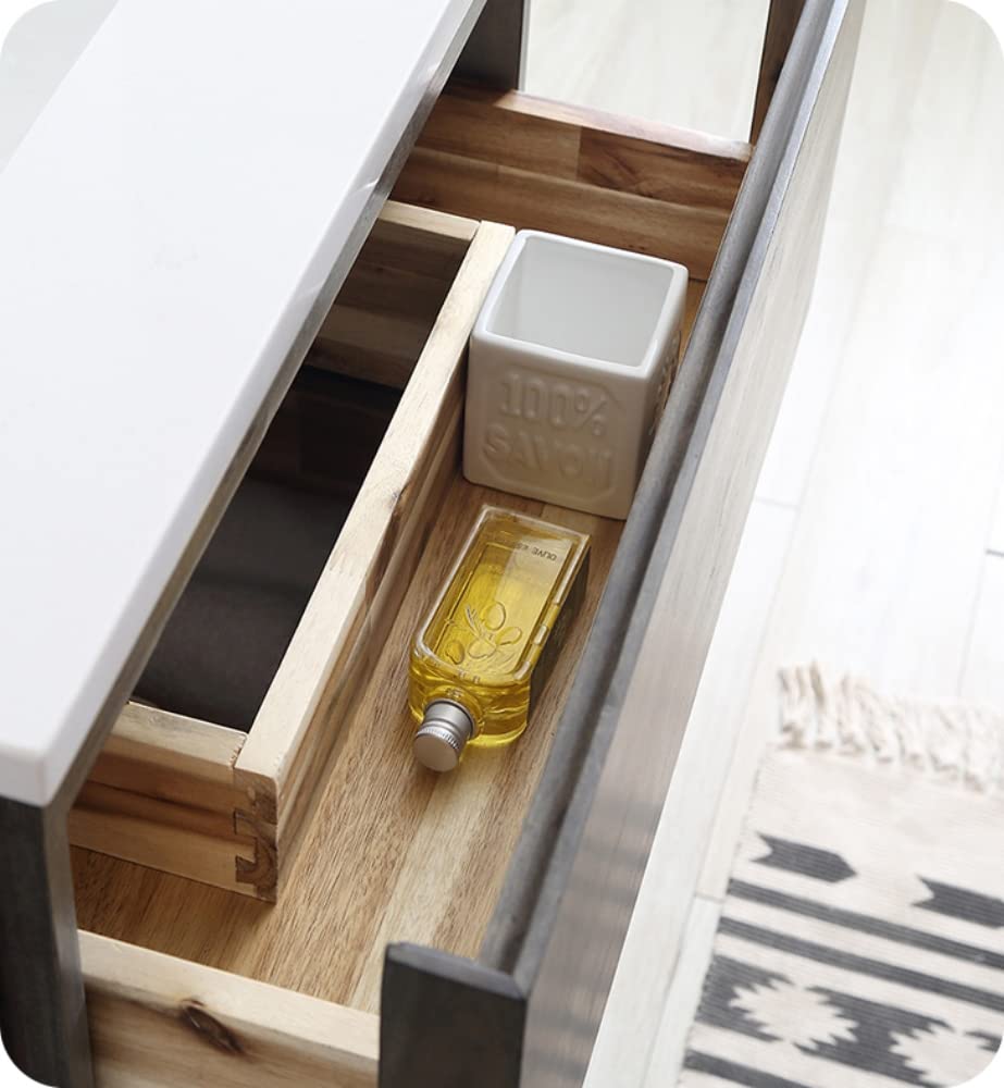 The Fresca Formosa Slat Bottom Open Shelf Bathroom Vanity is superbly crafted of solid Acacia wood, known for its magnificent beauty and durability. It has a warm grey finish with a hint of brown throughout, and a natural grain that will inject luxurious warmth into any space. A masterpiece of elegance and style, this free-standing vanity measures 30 in width. Two solid wood, soft-closing dovetail drawers are perfect for organizing all of your daily essentials. The solid pine drawers are clear coated and feature a mitered, wrap-around design that adds to the superior detailing. Cove routed pulls are carved directly into the drawers keeping the design sharp and sophisticated. This handsome vanity also has an open slatted shelf on the bottom, perfect for storing hand towels or other necessities. Gracing the top of the vanity is a stunning 30 quartz stone countertop and ceramic undermount basin. The white ceramic basin is equipped with an overflow and the countertop has been pre-drilled to accommodate the faucet of your choice. A p-trap, pop-up drain and installation hardware are included. This Formosa Wall Mount Bathroom Vanity comes with a matching 26 Acacia Mirror with a frame that is cove routed and mitered, providing the perfect finishing touch.