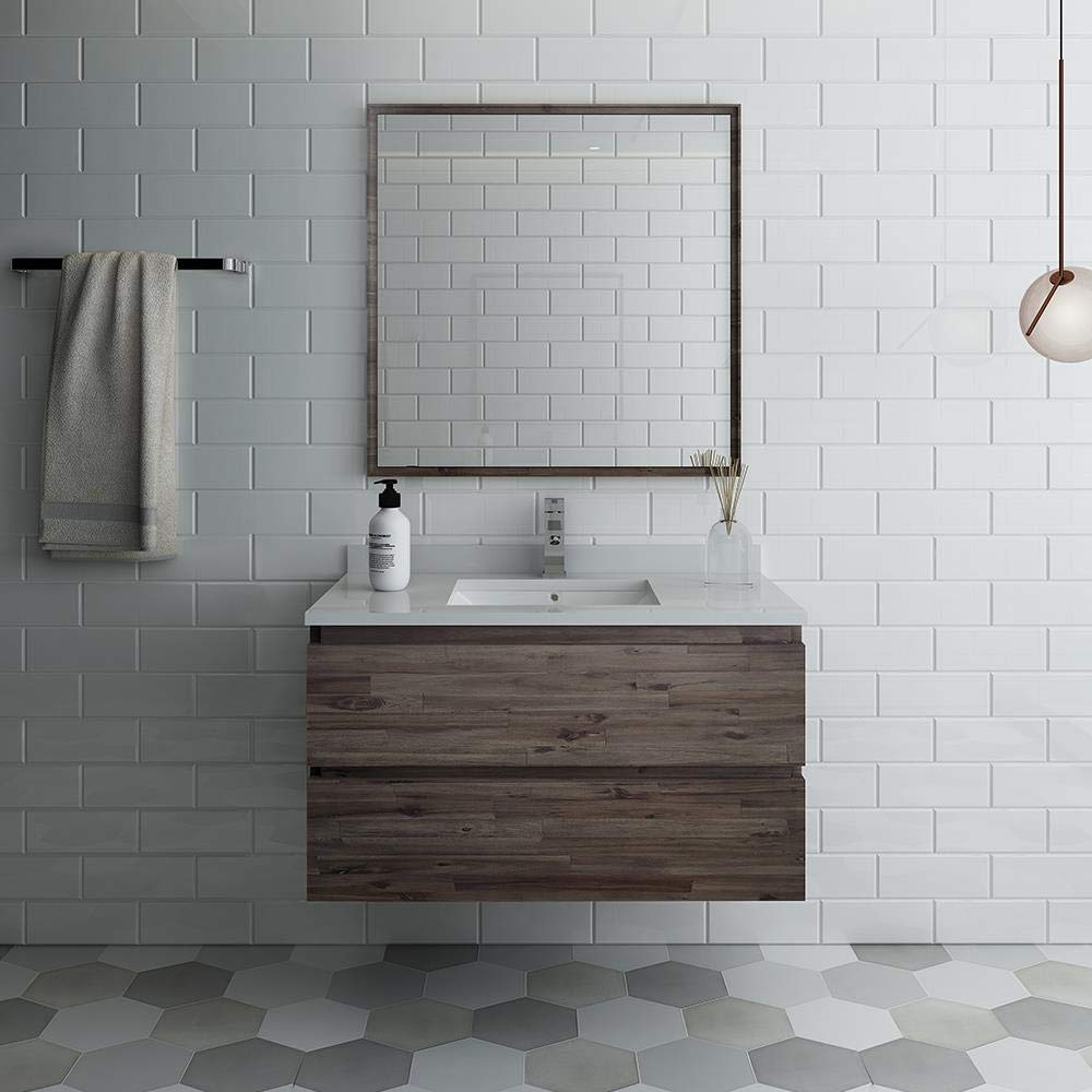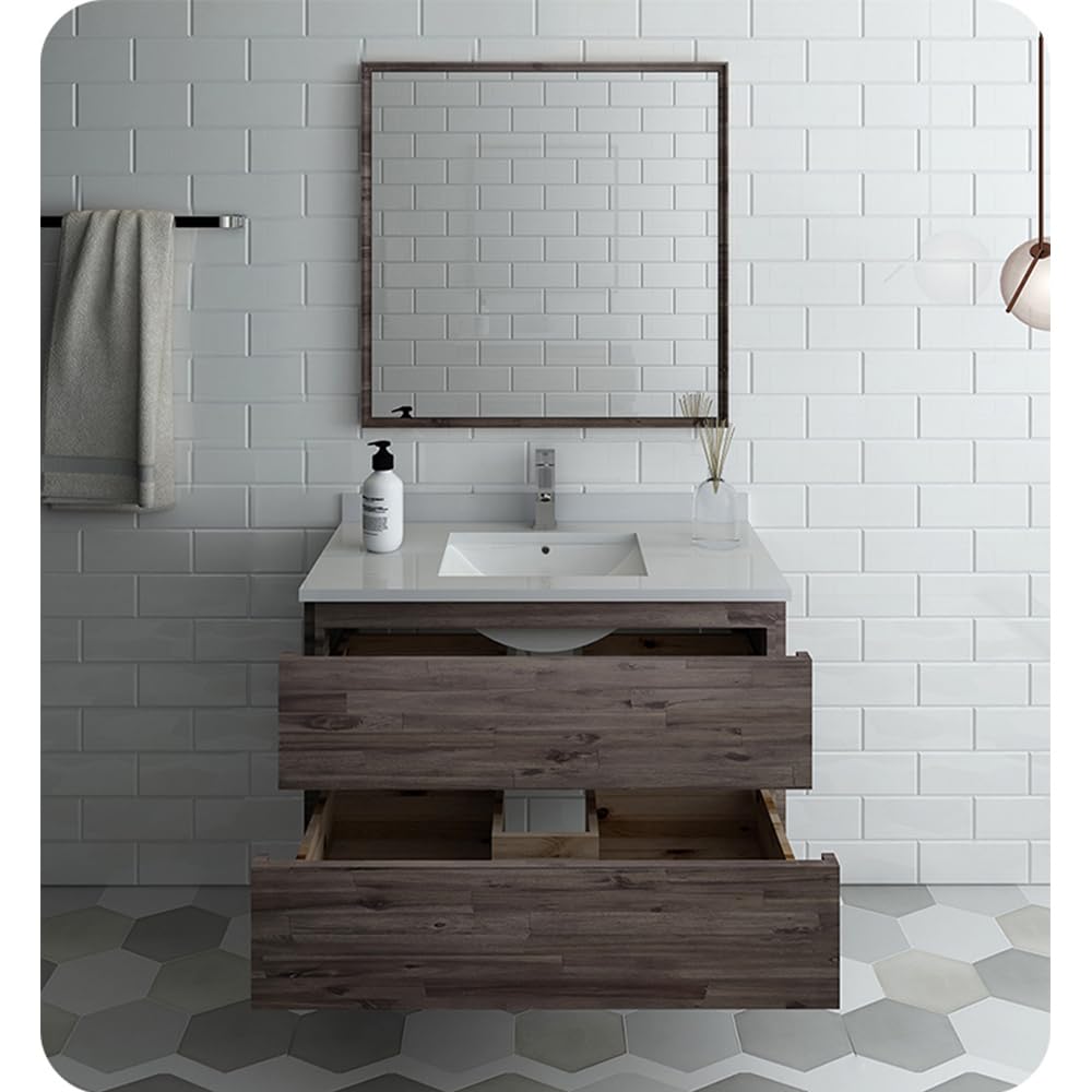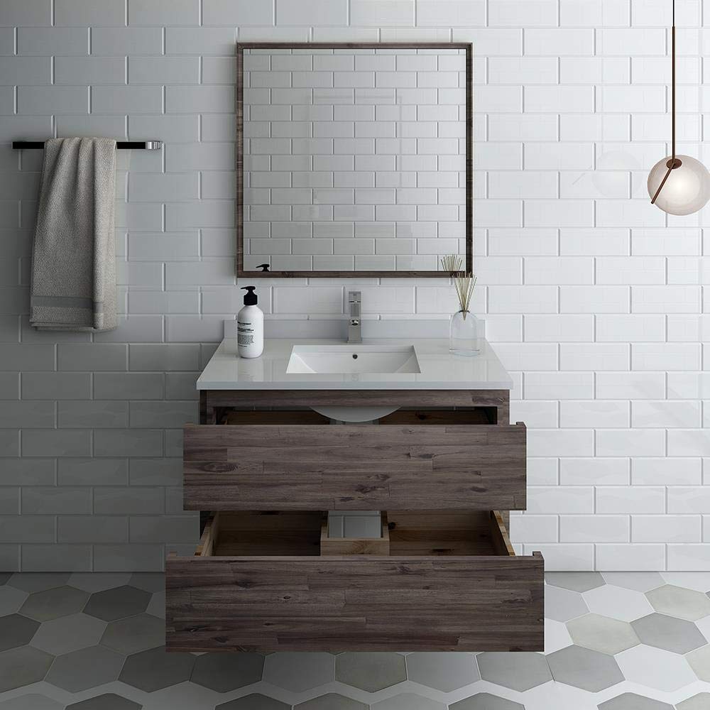 The Fresca Formosa Wall Mount Bathroom Vanity is superbly crafted of solid Acacia wood, known for its magnificent beauty and durability. It has a warm grey finish with a hint of brown throughout, and a natural grain that will inject luxurious warmth into any space. A masterpiece of elegance and style, this wall-mounted vanity measures 36 in width. Two solid wood, soft-closing dovetail drawers are perfect for organizing all of your daily essentials. The solid pine drawers are clear coated and feature a mitered, wrap-around design that adds to the superior detailing. Cove routed pulls are carved directly into the drawers keeping the design sharp and sophisticated. Gracing the top of the vanity is a stunning 36 quartz stone countertop and ceramic undermount basin. The white ceramic basin is equipped with an overflow and the countertop has been pre-drilled to accommodate the faucet of your choice. A p-trap, pop-up drain and installation hardware are included. This Formosa Wall Mount Bathroom Vanity comes with a matching 30 Acacia Mirror with a frame that is cove routed and mitered, providing the perfect finishing touch.