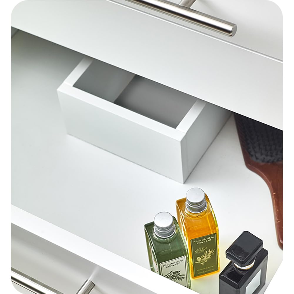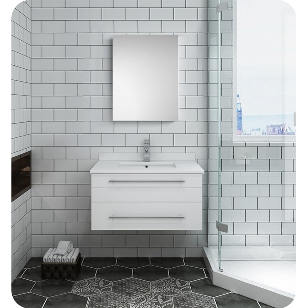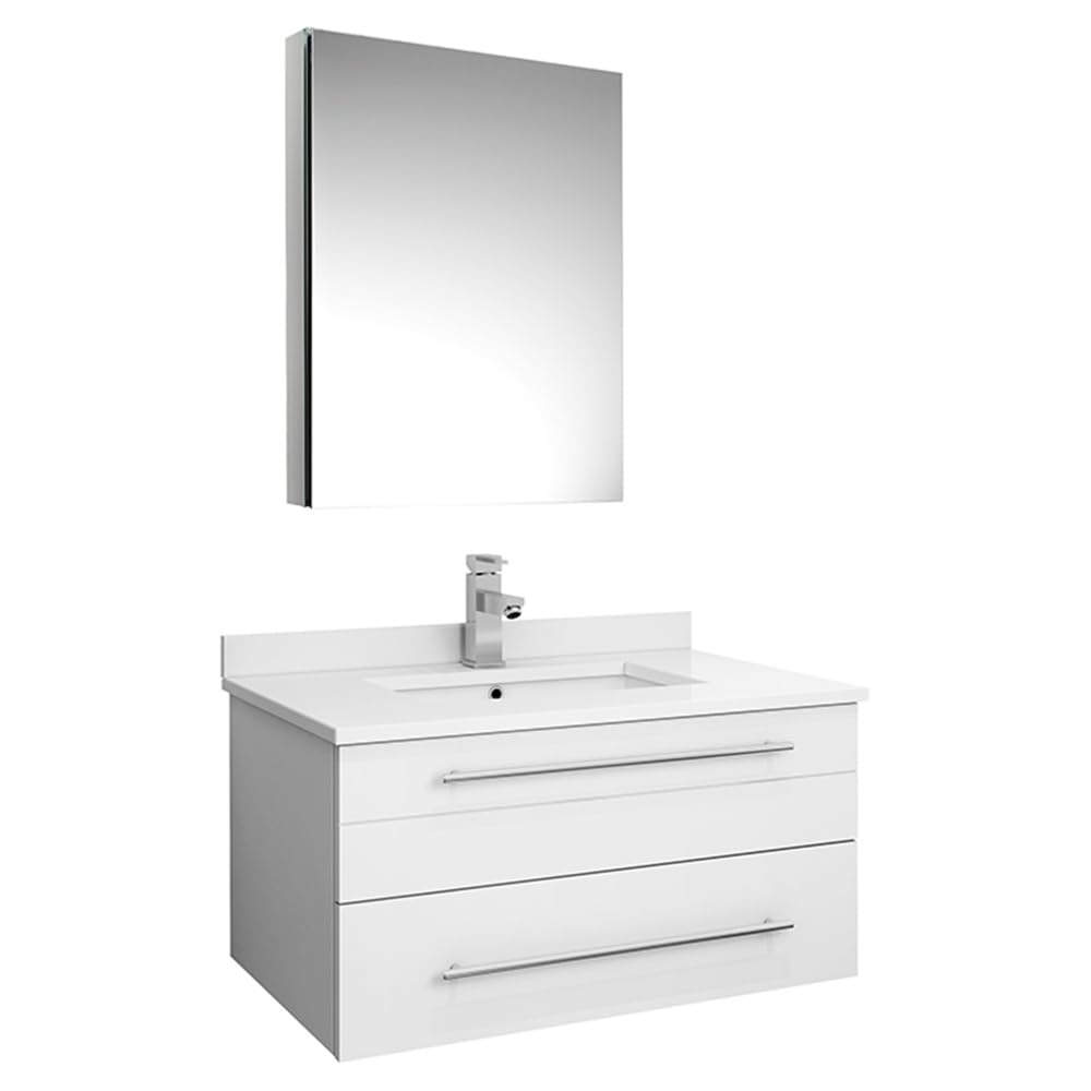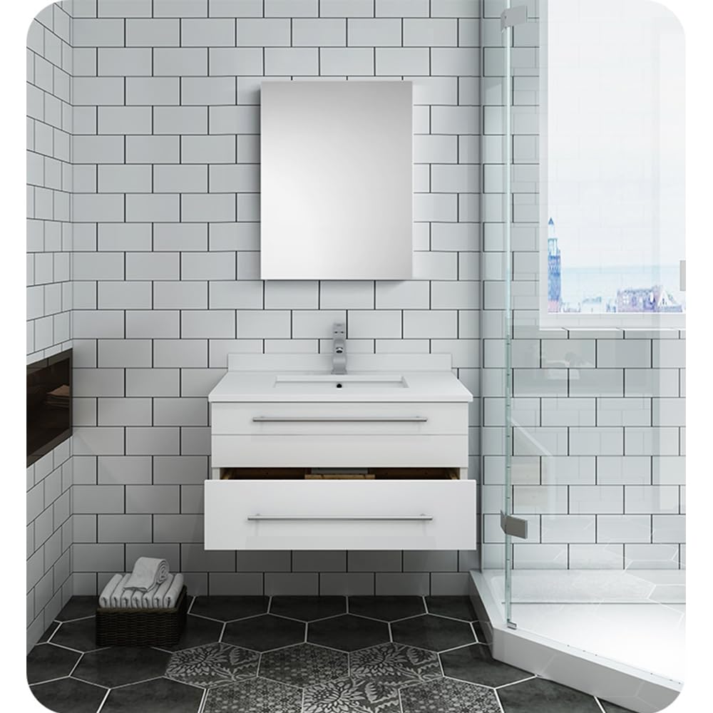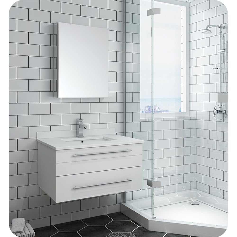 Classically simple with clean lines and a contoured undermount sink, this Fresca Lucera Wall Hung Modern Bathroom Vanity will bring out the best in any bathroom. Measuring 30 in width, this sophisticated vanity has one soft-closing drawer with a decorative beveled drawer plate design and slim brushed metal handle. This modern wall hung vanity has a chic painted White finish. Gracing the top of the vanity is a striking quartz stone countertop with backsplash and a white ceramic undermount sink. The sink is equipped with an integrated overflow and comes with a single hole faucet, p-trap, pop-up drain and installation hardware. A matching frameless Fresca 20 Bathroom Medicine Cabinet is also included.