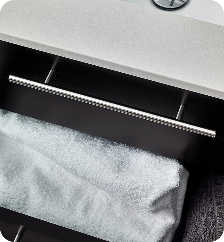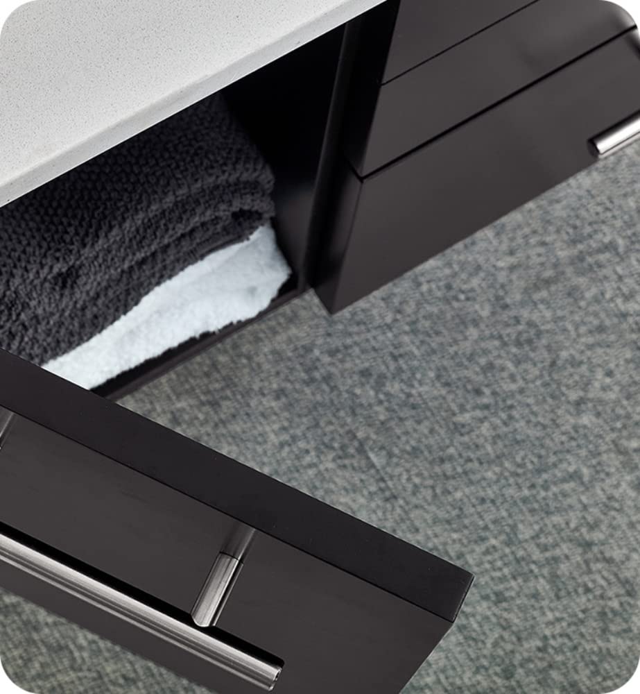 Classically simple with clean lines and a contoured undermount sink, this Fresca Lucera Wall Hung Modern Bathroom Vanity will bring out the best in any bathroom. Measuring 36 in width, this sophisticated vanity has a well constructed solid wood frame with a roomy right-side compartment for holding bathroom essentials and a spacious drawer with a decorative beveled drawer plate design. The door and drawer are soft-closing and feature slim brushed metal handles. This modern vanity has a chic painted Espresso finish. Gracing the top of the vanity is a striking quartz stone countertop with backsplash and a white ceramic undermount sink. The sink is equipped with an integrated overflow and comes with a single hole faucet, p-trap, pop-up drain and installation hardware. A matching frameless Fresca 30 Bathroom Medicine Cabinet is also included. It features soft-close, hinged doors.