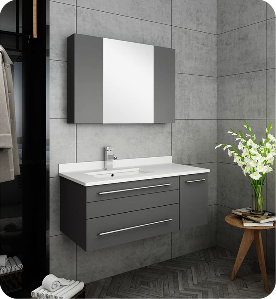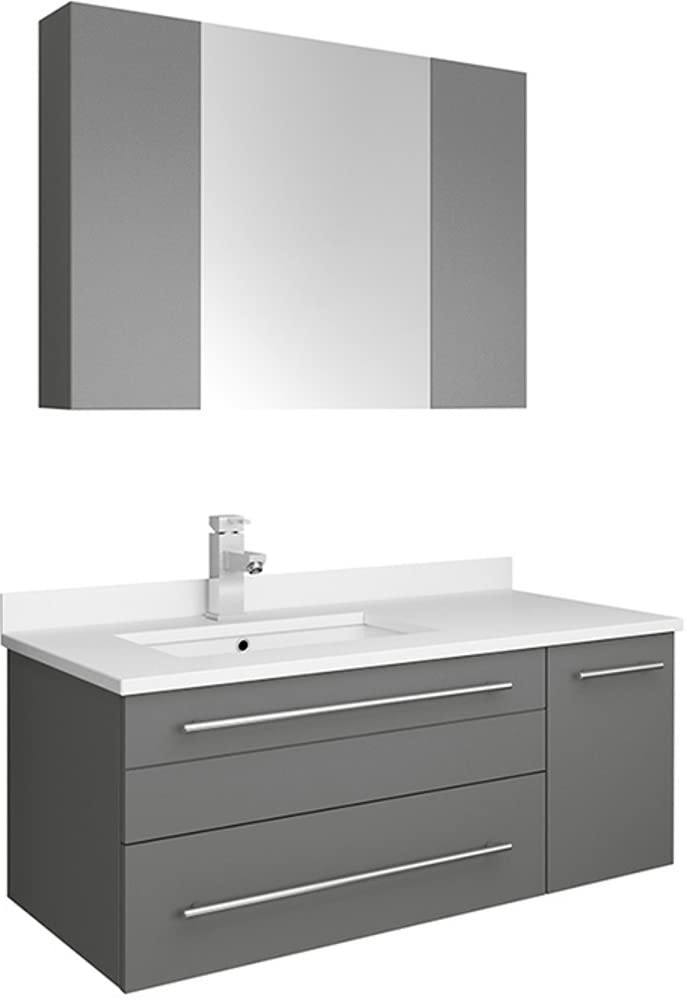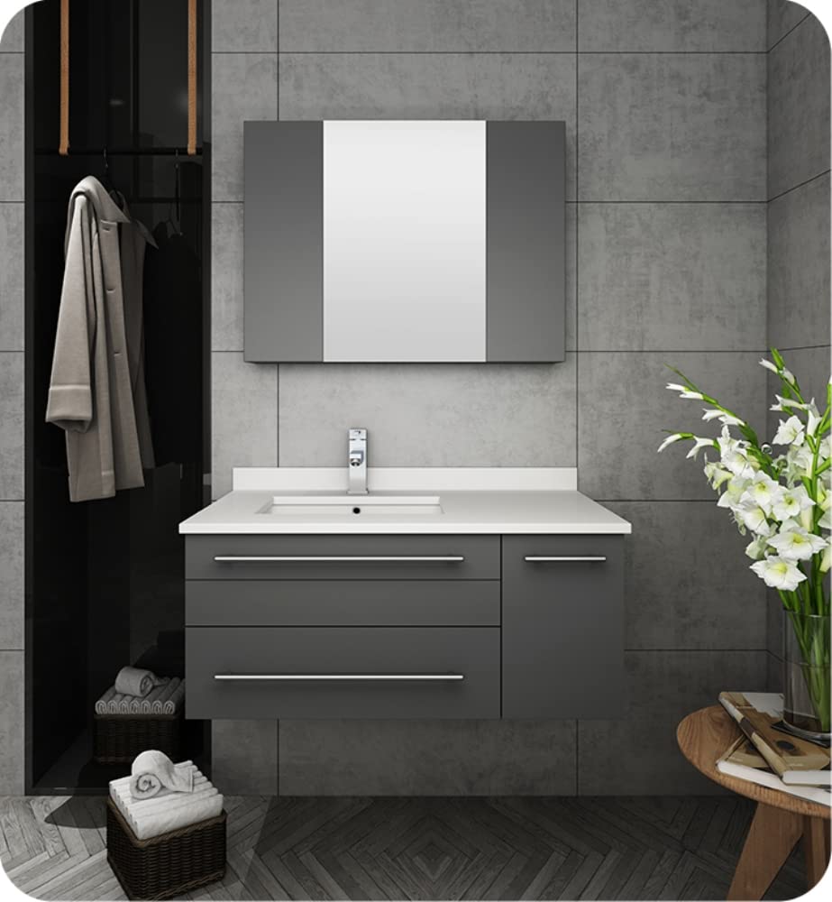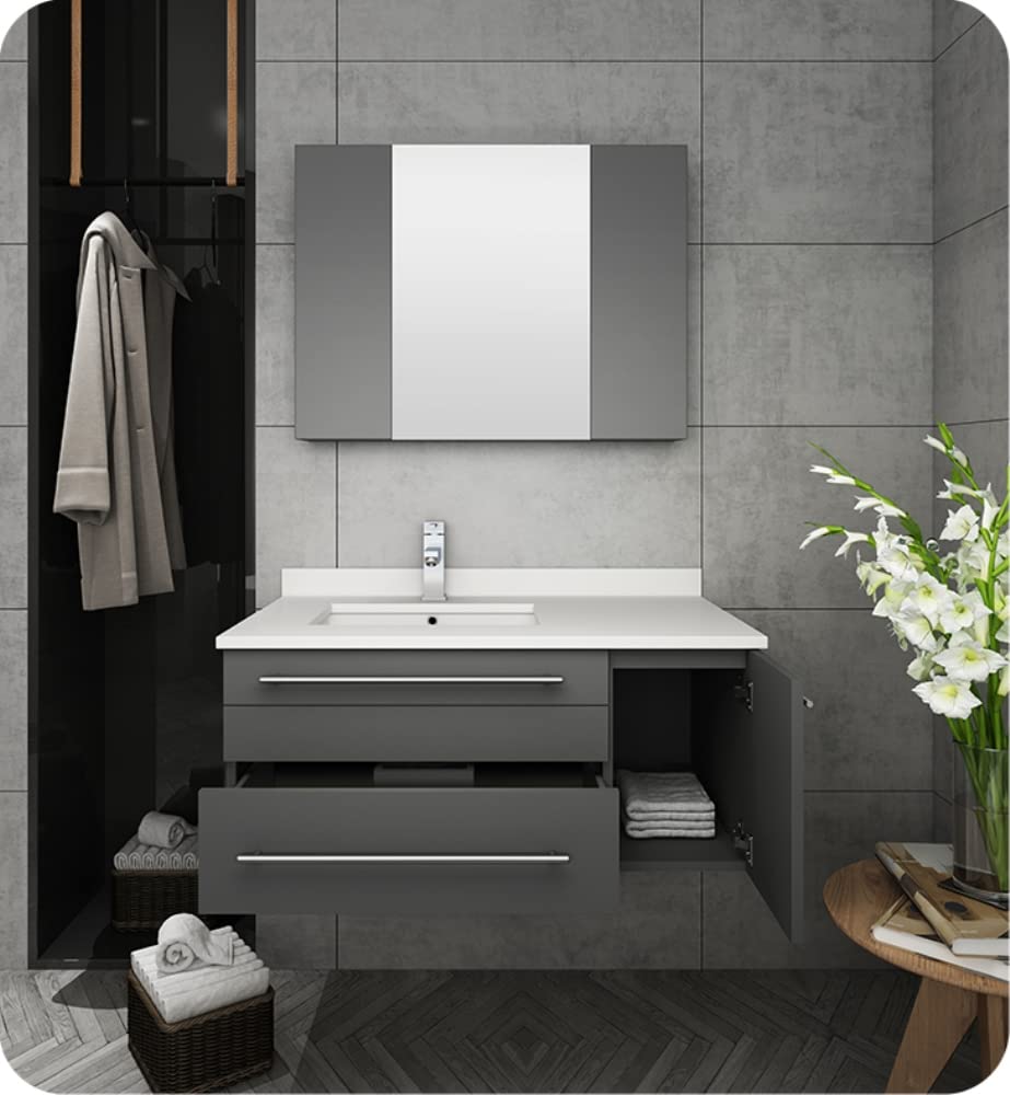 Classically simple with clean lines and a contoured undermount sink, this Fresca Lucera Wall Hung Modern Bathroom Vanity will bring out the best in any bathroom. Measuring 36 in width, this sophisticated vanity has a well constructed solid wood frame with a roomy left-side compartment for holding bathroom essentials and a spacious drawer with a decorative beveled drawer plate design. The door and drawer are soft-closing and feature slim brushed metal handles. This modern vanity has a chic painted Gray finish. Gracing the top of the vanity is a striking quartz stone countertop with backsplash and a white ceramic undermount sink. The sink is equipped with an integrated overflow and comes with a single hole faucet, p-trap, pop-up drain and installation hardware. A matching frameless Fresca 30 Bathroom Medicine Cabinet is also included. It features soft-close, hinged doors.
