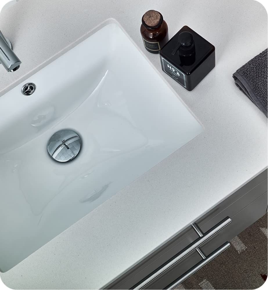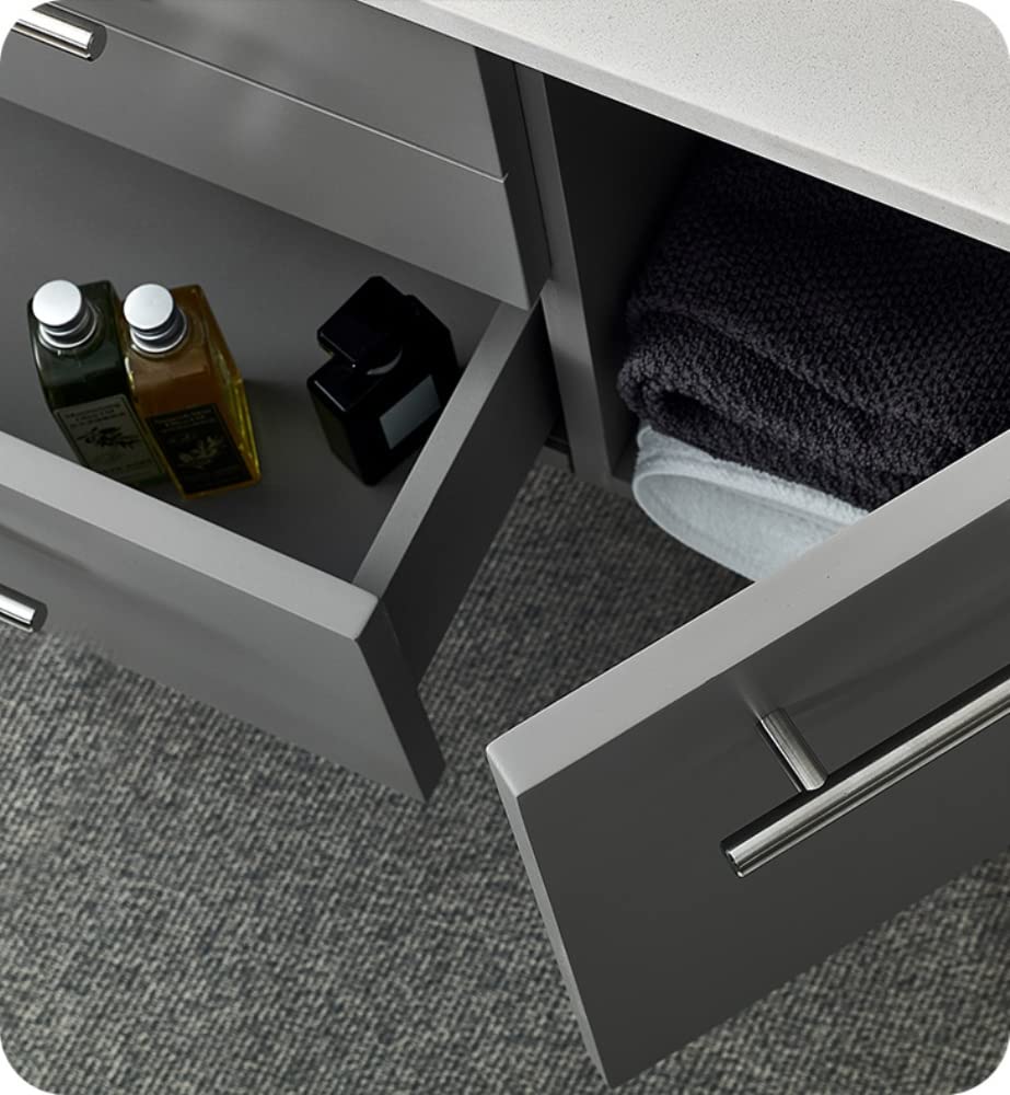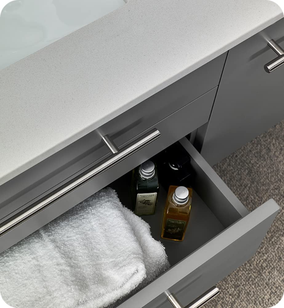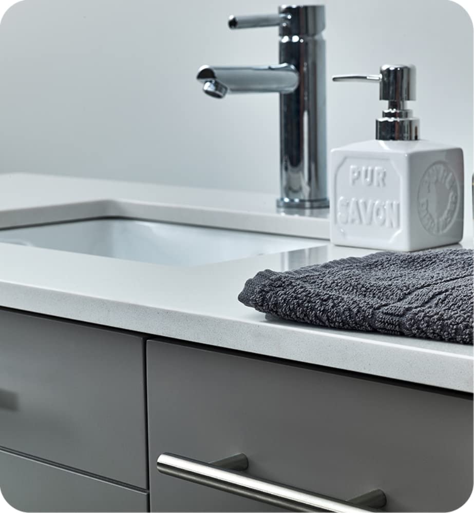 Classically simple with clean lines and a contoured undermount sink, this Fresca Lucera Wall Hung Modern Bathroom Vanity will bring out the best in any bathroom. Measuring 36 in width, this sophisticated vanity has a well constructed solid wood frame with a roomy left-side compartment for holding bathroom essentials and a spacious drawer with a decorative beveled drawer plate design. The door and drawer are soft-closing and feature slim brushed metal handles. This modern vanity has a chic painted Gray finish. Gracing the top of the vanity is a striking quartz stone countertop with backsplash and a white ceramic undermount sink. The sink is equipped with an integrated overflow and comes with a single hole faucet, p-trap, pop-up drain and installation hardware. A matching frameless Fresca 30 Bathroom Medicine Cabinet is also included. It features soft-close, hinged doors.