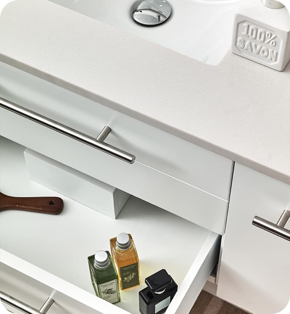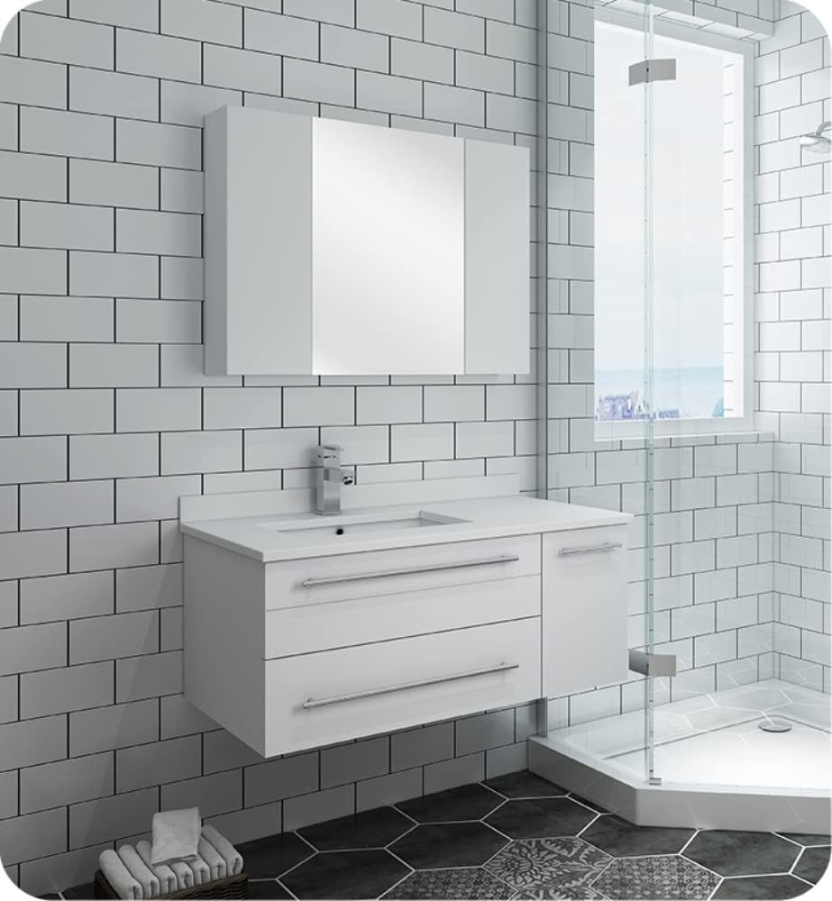 Classically simple with clean lines and a contoured undermount sink, this Fresca Lucera Wall Hung Modern Bathroom Vanity will bring out the best in any bathroom. Measuring 36 in width, this sophisticated vanity has a well constructed solid wood frame with a roomy left-side compartment for holding bathroom essentials and a spacious drawer with a decorative beveled drawer plate design. The door and drawer are soft-closing and feature slim brushed metal handles. This modern wall hung vanity has a chic painted White finish. Gracing the top of the vanity is a striking quartz stone countertop with backsplash and a white ceramic undermount sink. The sink is equipped with an integrated overflow and comes with a single hole faucet, p-trap, pop-up drain and installation hardware. A matching frameless Fresca 30 Bathroom Medicine Cabinet is also included. It features soft-close, hinged doors.