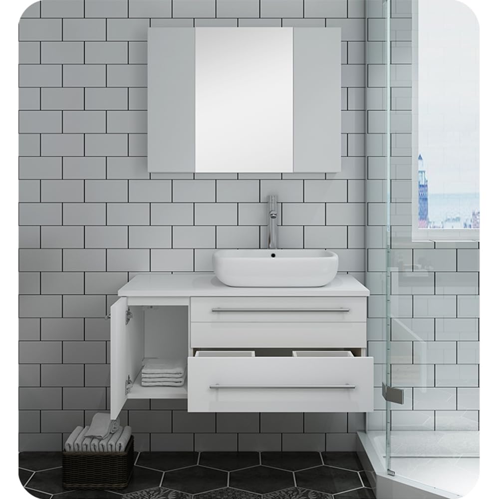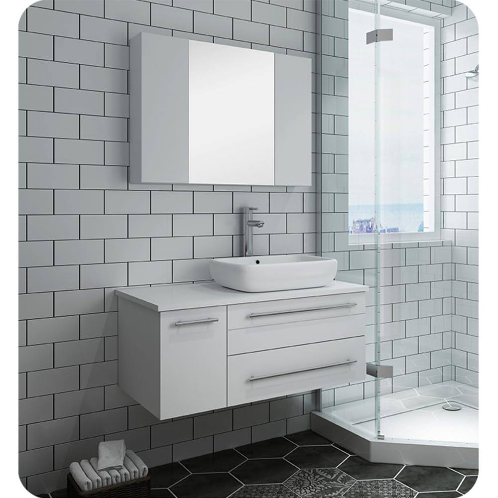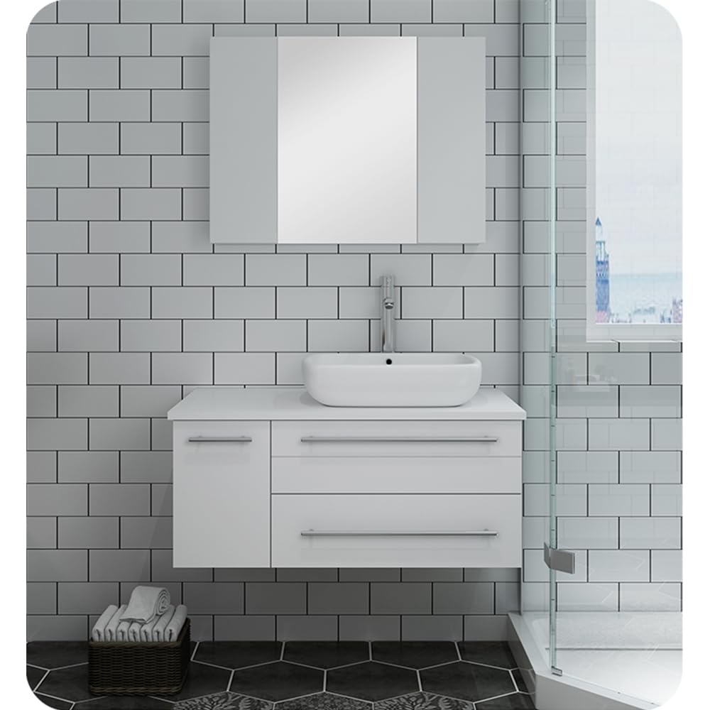 Classically simple with clean lines and a beautiful vessel sink, this Fresca Lucera Wall Hung Modern Bathroom Vanity will bring out the best in any bathroom. Measuring 36 in width, this sophisticated vanity has a well constructed solid wood frame with a roomy right-side compartment for holding bathroom essentials and two spacious drawers with a decorative beveled drawer plate design. The door and drawers are soft-closing and feature slim brushed metal handles. This modern wall hung vanity has a chic painted White finish. Gracing the top of the vanity is a striking quartz stone countertop with a white vessel sink. The sink is equipped with an integrated overflow and comes with a single hole vessel faucet, p-trap, pop-up drain and installation hardware. A matching frameless Fresca 30 Bathroom Medicine Cabinet is also included. It features soft-close, hinged doors.
