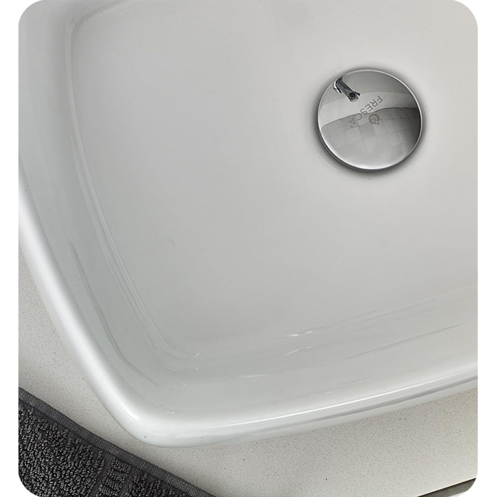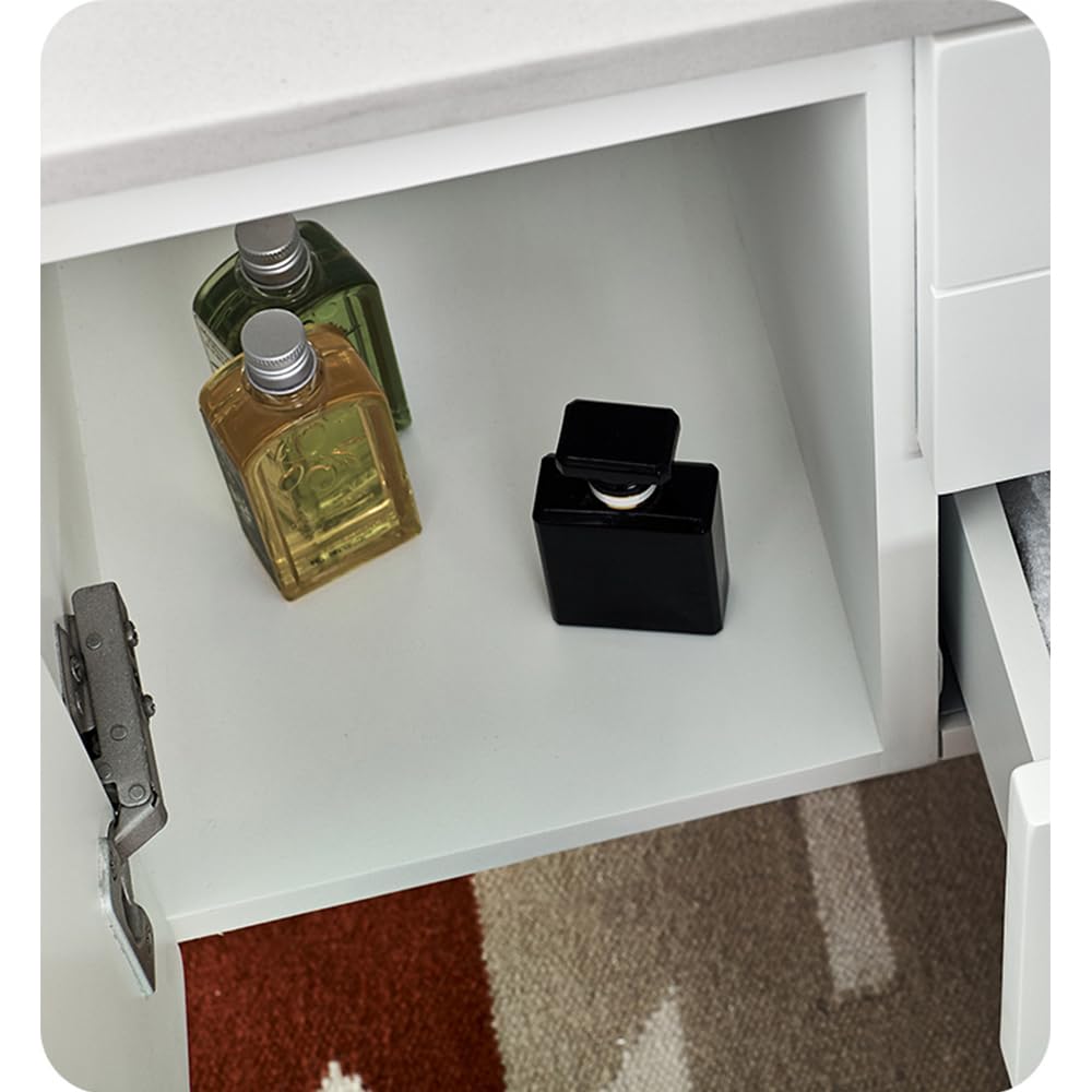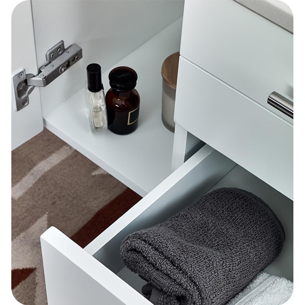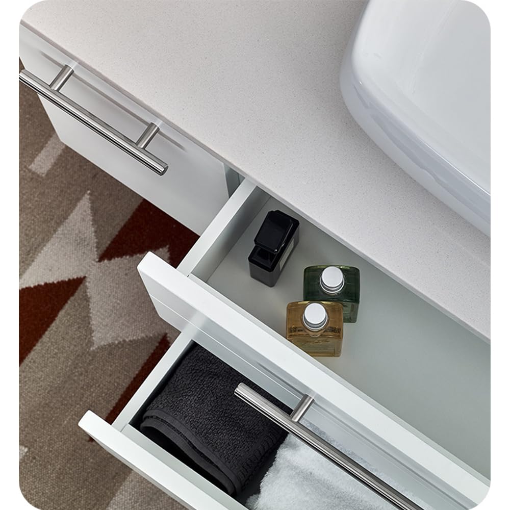 Classically simple with clean lines and a beautiful vessel sink, this Fresca Lucera Wall Hung Modern Bathroom Vanity will bring out the best in any bathroom. Measuring 36 in width, this sophisticated vanity has a well constructed solid wood frame with a roomy right-side compartment for holding bathroom essentials and two spacious drawers with a decorative beveled drawer plate design. The door and drawers are soft-closing and feature slim brushed metal handles. This modern wall hung vanity has a chic painted White finish. Gracing the top of the vanity is a striking quartz stone countertop with a white vessel sink. The sink is equipped with an integrated overflow and comes with a single hole vessel faucet, p-trap, pop-up drain and installation hardware. A matching frameless Fresca 30 Bathroom Medicine Cabinet is also included. It features soft-close, hinged doors.