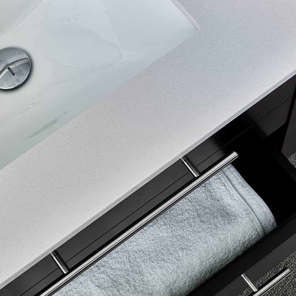 - Materials: Solid wood frame with MDF panels, quartz stone countertop with backsplash, ceramic undermount sink with overflow