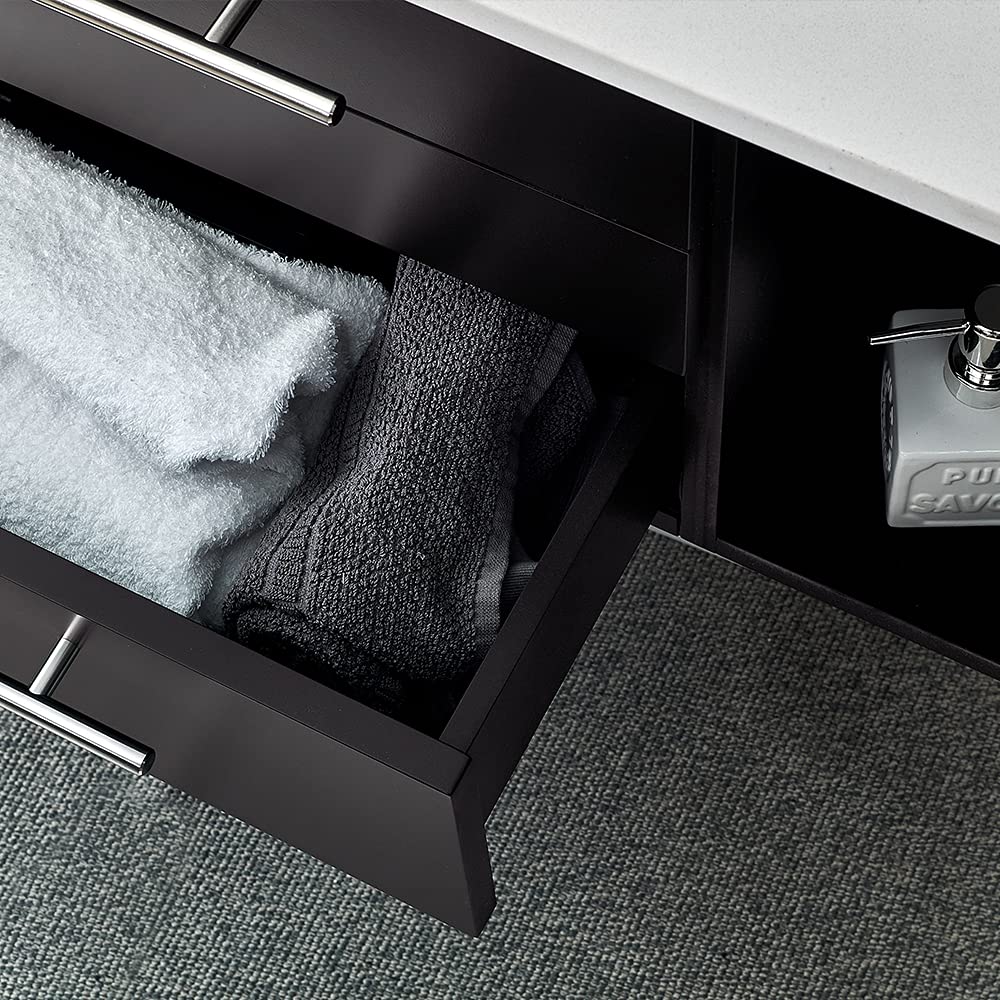 Classically simple with clean lines and a contoured undermount sink, this Fresca Lucera Wall Hung Modern Bathroom Vanity will bring out the best in any bathroom. Measuring 48 in width, this sophisticated vanity has a well constructed solid wood frame with two roomy storage compartments for holding bathroom essentials and a spacious drawer with a decorative beveled drawer plate design. The doors and drawer are soft-closing and feature slim brushed metal handles. This modern wall hung vanity has a chic painted White finish. Gracing the top of the vanity is a striking quartz stone countertop with backsplash and a white ceramic undermount sink. The sink is equipped with an integrated overflow and comes with a single hole faucet, p-trap, pop-up drain and installation hardware. A matching Fresca 32 Bathroom Medicine Cabinet in a stylish White finish is also included. The medicine cabinet has a mirrored middle section and two side compartments. It features soft-close, hinged doors.