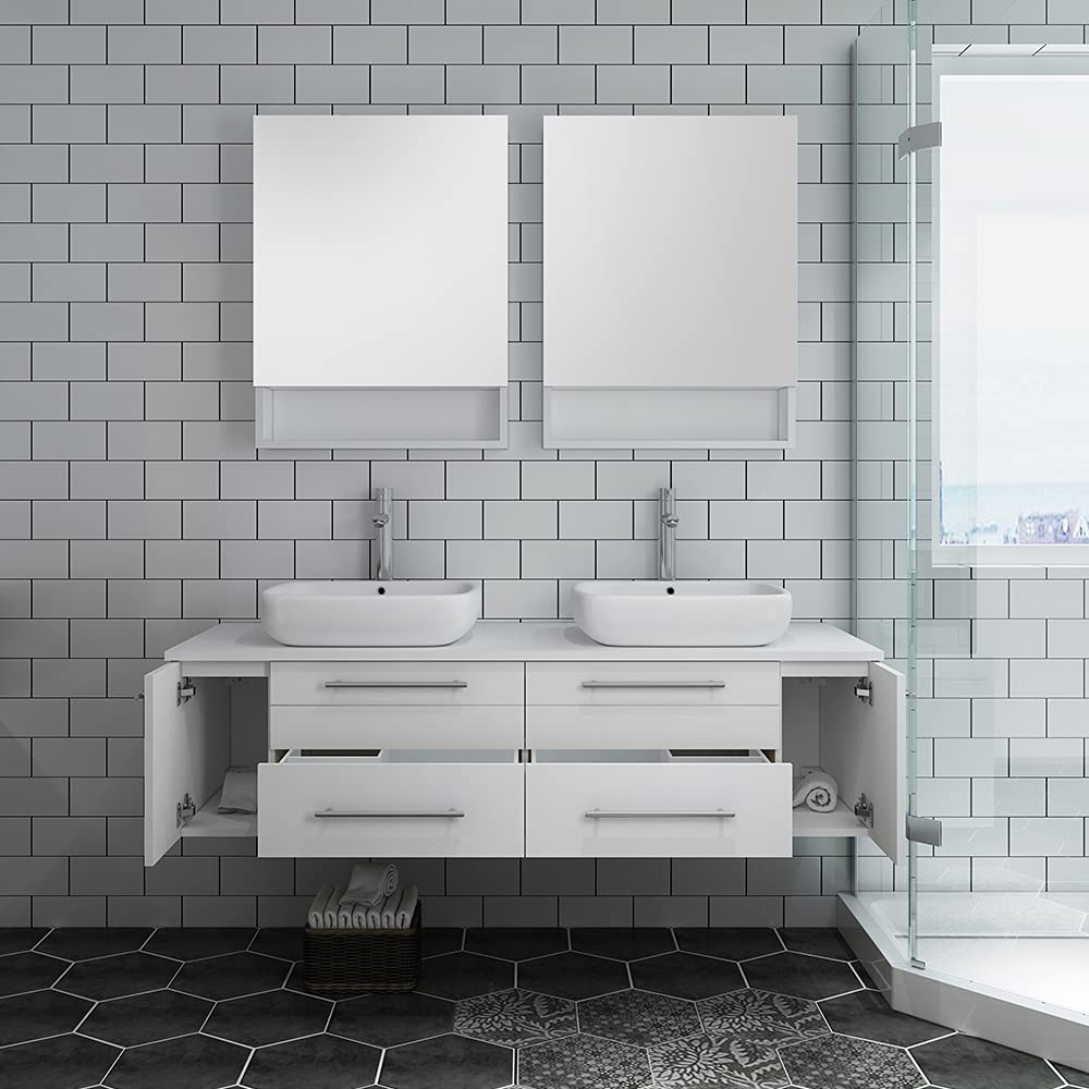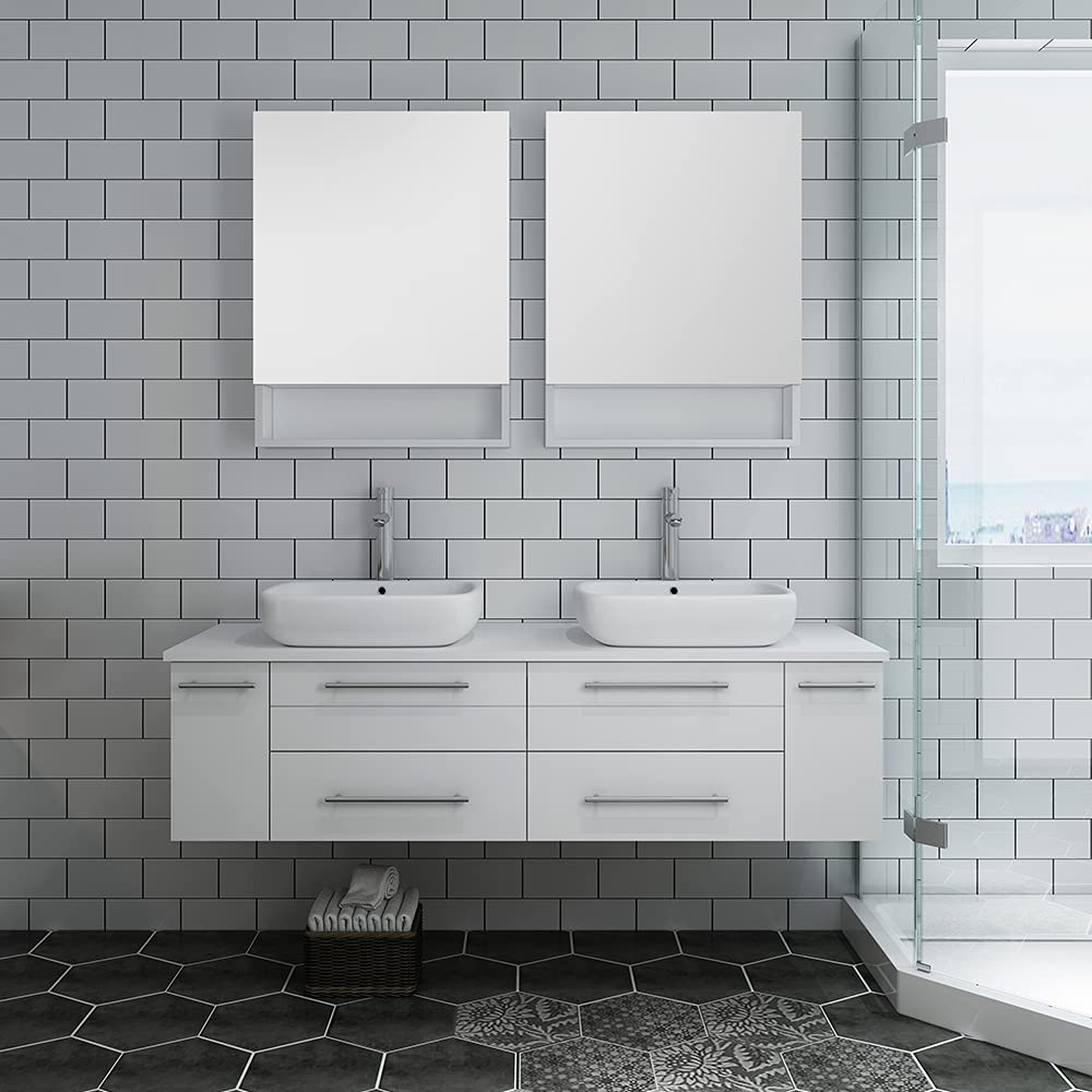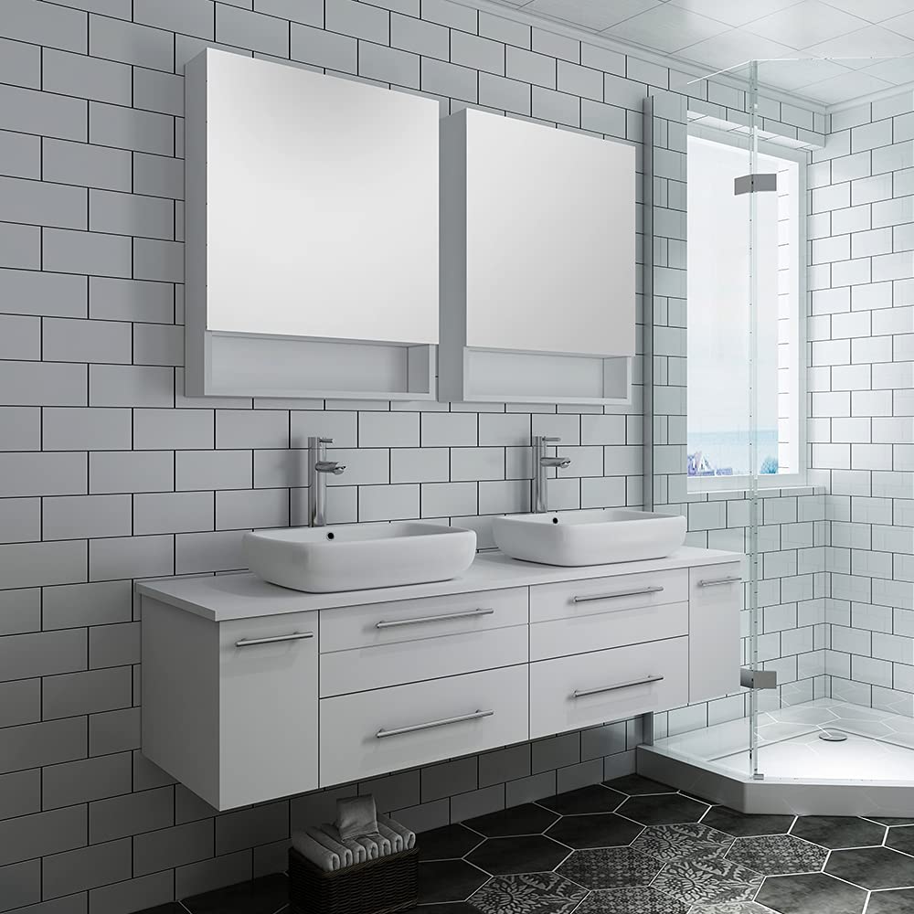 Classically simple with clean lines and two beautiful vessel sinks, this Fresca Lucera Wall Hung Modern Bathroom Vanity will bring out the best in any bathroom. Measuring 60” in width, this sophisticated vanity has a well constructed solid wood frame with two roomy storage compartments for holding bathroom essentials and two spacious drawers with a decorative beveled drawer plate design. The doors and drawers are soft-closing and feature slim brushed metal handles. This modern vanity has a chic painted Gray finish. Gracing the top of the vanity is a striking quartz stone countertop with two white vessel sinks. Each sink is equipped with an integrated overflow and comes with a single hole vessel faucet, p-trap, pop-up drain and installation hardware. This vanity comes with two Fresca 24” Bathroom Medicine Cabinets with Small Bottom Shelf. The mirrored medicine cabinets have a simple yet elegant frameless design and feature a stylish Gray finish. Each medicine cabinet has two adjustable glass interior shelves for storing items of varying heights and an integrated bottom shelf for rolled washcloths or decorative items.