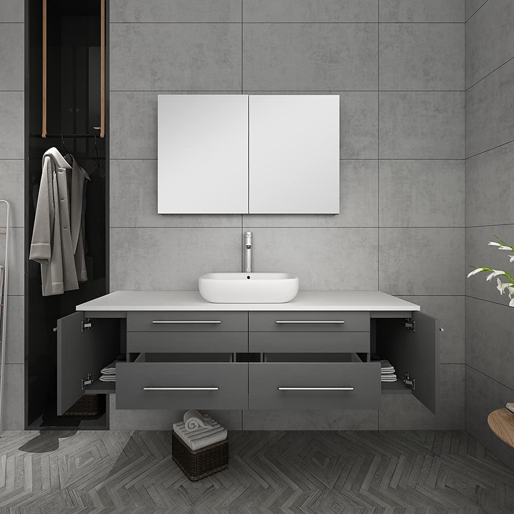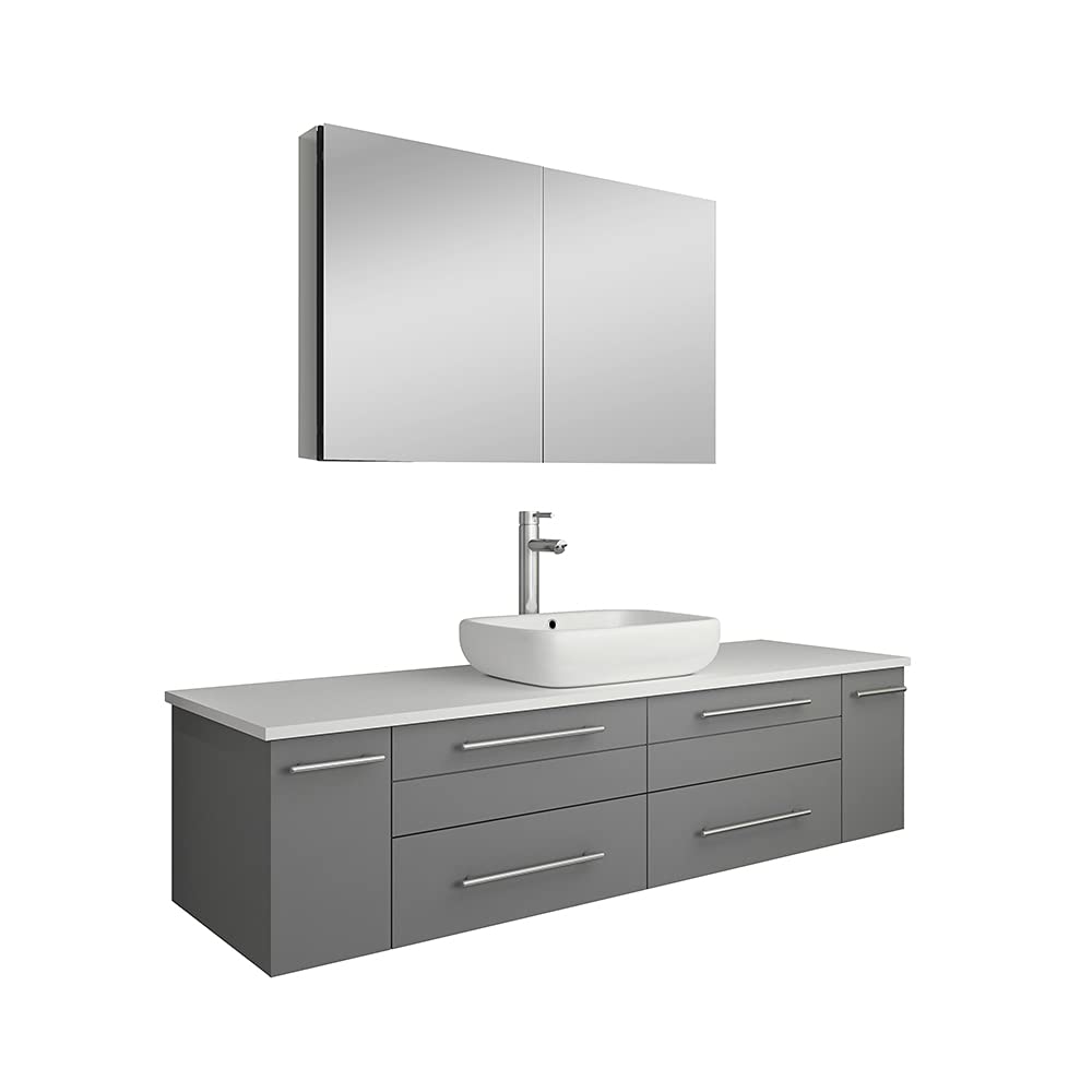 Classically simple with clean lines and a beautiful vessel sink, this Fresca Lucera Wall Hung Modern Bathroom Vanity will bring out the best in any bathroom. Measuring 60” in width, this sophisticated vanity has a well constructed solid wood frame with two roomy storage compartments for holding bathroom essentials and four spacious drawers with a decorative beveled drawer plate design. The doors and drawers are soft-closing and feature slim brushed metal handles. This modern wall hung vanity has a chic painted White finish. Gracing the top of the vanity is a striking quartz stone countertop with a white vessel sink. The sink is equipped with an integrated overflow and comes with a single hole vessel faucet, p-trap, pop-up drain and installation hardware. This vanity comes with a Fresca 40” Bathroom Medicine Cabinet. The medicine cabinet features mirrors on the front, along the edges and also on the interior. Two tempered glass shelves provide great storage space.