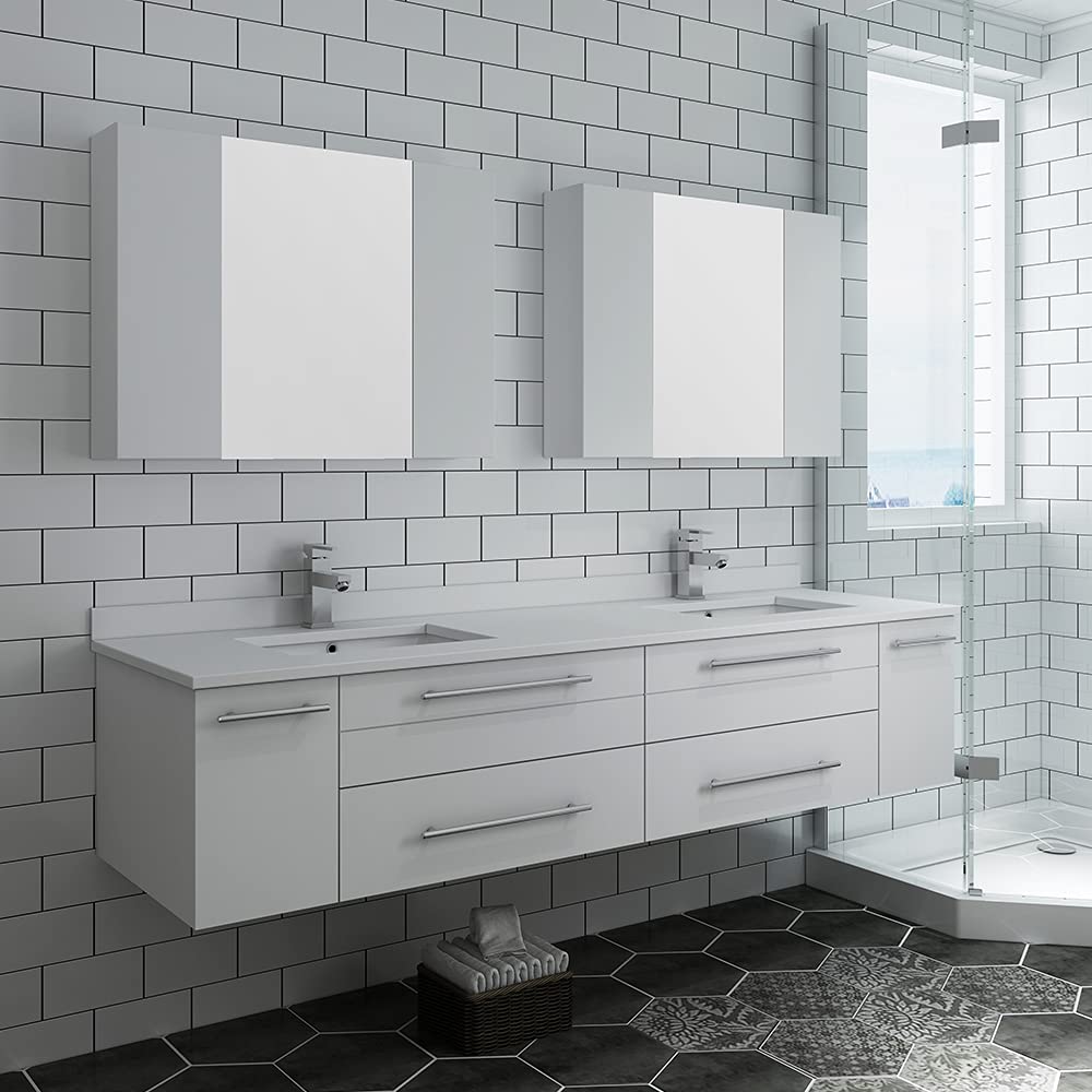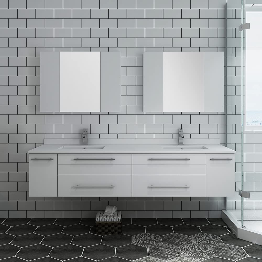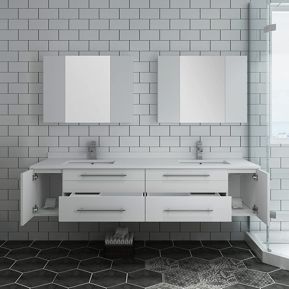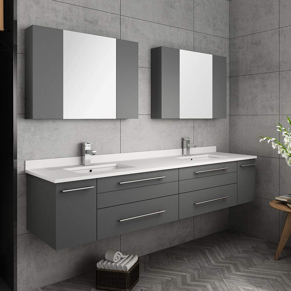 Classically simple with clean lines and two contoured undermount sinks, this Fresca Lucera Wall Hung Modern Bathroom Vanity will bring out the best in any bathroom. Measuring 72” in width, this sophisticated vanity has a well constructed solid wood frame with two roomy storage compartments for holding bathroom essentials and two spacious drawers with a decorative beveled drawer plate design. The doors and drawers are soft-closing and feature slim brushed metal handles. This modern vanity has a chic painted Gray finish. Gracing the top of the vanity is a striking quartz stone countertop with backsplash and two white ceramic undermount sinks. Each sink is equipped with an integrated overflow and comes with a single hole faucet, p-trap, pop-up drain and installation hardware. This vanity comes with two matching Fresca 32” Bathroom Medicine Cabinets with a stylish Gray finish. Each medicine cabinet has a mirrored middle section and two side compartments that offer additional storage. The medicine cabinets feature soft-close, hinged doors. There’s a total of six handy compartments within each unit to keep essentials neatly tucked away.