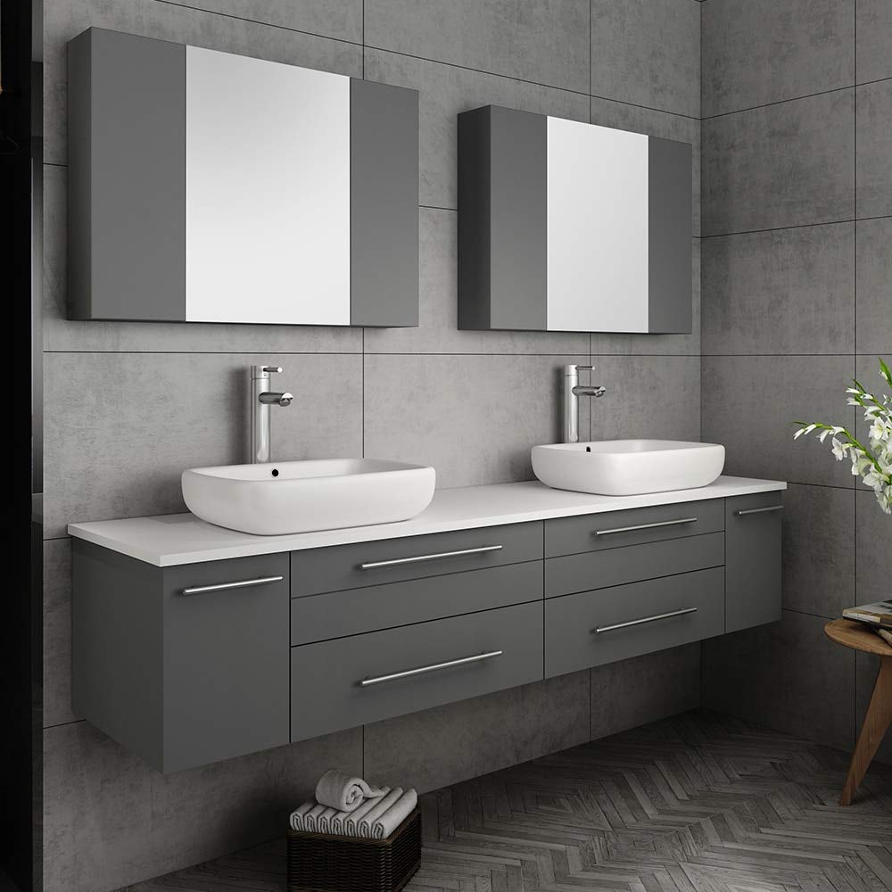 Classically simple with clean lines and two beautiful vessel sinks, this Fresca Lucera Wall Hung Modern Bathroom Vanity will bring out the best in any bathroom. Measuring 72 in width, this sophisticated vanity has a well constructed solid wood frame with two roomy storage compartments for holding bathroom essentials and two spacious drawers with a decorative beveled drawer plate design. The doors and drawers are soft-closing and feature slim brushed metal handles. This modern vanity has a chic painted Gray finish. Gracing the top of the vanity is a striking quartz stone countertop with two white vessel sinks. Each sink is equipped with an integrated overflow and comes with a single hole vessel faucet, p-trap, pop-up drain and installation hardware. This vanity comes with two matching Fresca 32 Bathroom Medicine Cabinets with a stylish Gray finish. Each medicine cabinet has a mirrored middle section and two side compartments that offer additional storage. The medicine cabinets feature soft-close, hinged doors. Theres a total of six handy compartments within each unit to keep essentials neatly tucked away.
