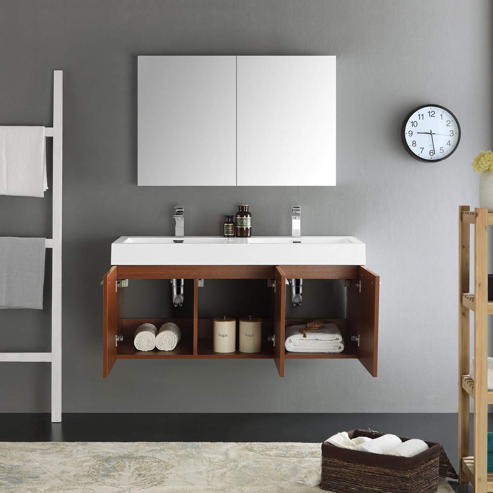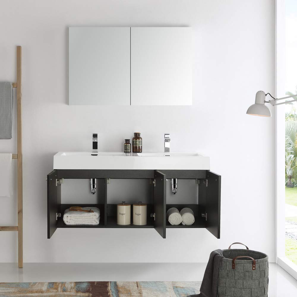 Take your bathroom from basic to beautiful with the Fresca Vista line. The stunning white double sink has a contemporary look with a waved bottom, smooth lines and a thick profile. The contemporary 3 door Black wall mounted bathroom vanity offers superior storage, soft close doors and sleek brushed pulls. The frameless Medicine Cabinet has two doors with mirrors on both sides and two adjustable glass shelves to hold items of varying sizes. This lovely vanity and medicine cabinet is available in multiple sizes to give a chic, modern touch to any bathroom.