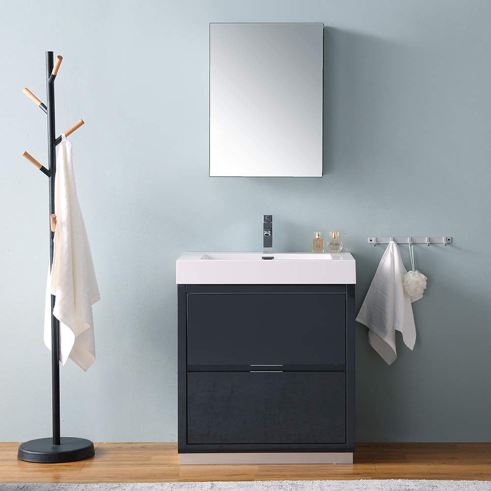 The Fresca Valencia Free Standing Modern Bathroom Vanity with Medicine Cabinet comes with everything you need to create an elegant and modern bathroom. The rectangular vanity offers great storage with two soft-closing drawers, just perfect for organizing all of your daily essentials. The drawers feature concealed aluminum handles and the cabinet has a stylish Glossy White finish. It rests on an aluminum base, adding to its modern look. The white acrylic-resin countertop/sink has smooth lines and a thick profile. It is equipped with an overflow, single hole faucet mount and includes a solid brass faucet. This ensemble also comes with a fully mirrored 20" medicine cabinet with two adjustable glass shelves, to complete the look. This lovely vanity is available in multiple sizes and makes a stylish statement in any home.