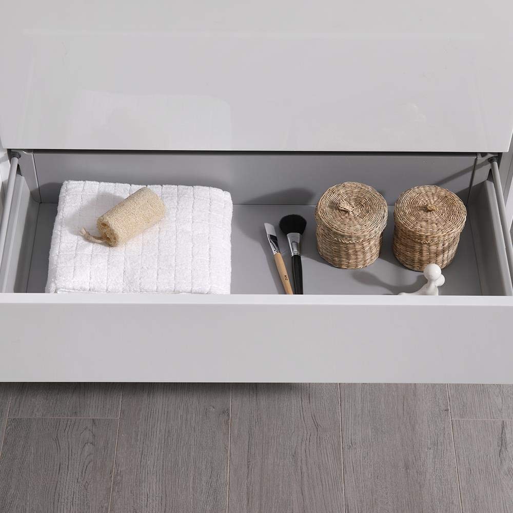 With its stylish White finish, the Fresca Catania Wall Hung Modern Bathroom Vanity adds a contemporary touch to any bathroom. Two spacious soft-closing metal frame drawers offer sensational storage space, perfect for keeping all of your daily essentials out of sight but within reach. The drawers feature push-release hardware, offering a streamlined front that beautifully complements the minimalist look. To make installation a breeze, the cabinet comes fully assembled and includes installation hardware. Gracing the top of the cabinet is an eye-catching white acrylic-resin countertop/sink with smooth edges and integrated overflow. The sink is designed for durability and style and has been pre-drilled to accommodate a single hole faucet (included). This vanity also comes with a fully mirrored medicine cabinet with two adjustable glass shelves, to complete the look. This lovely vanity is available in multiple colors and makes a stylish statement in any home