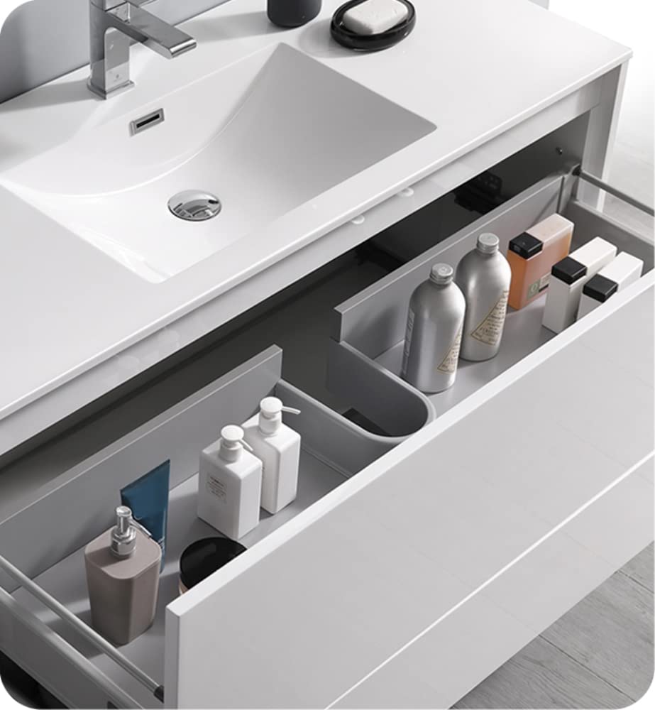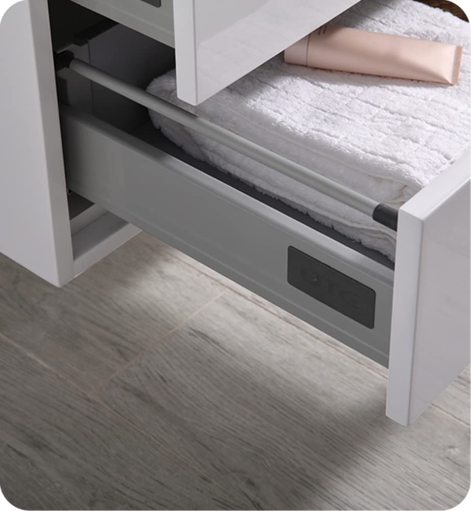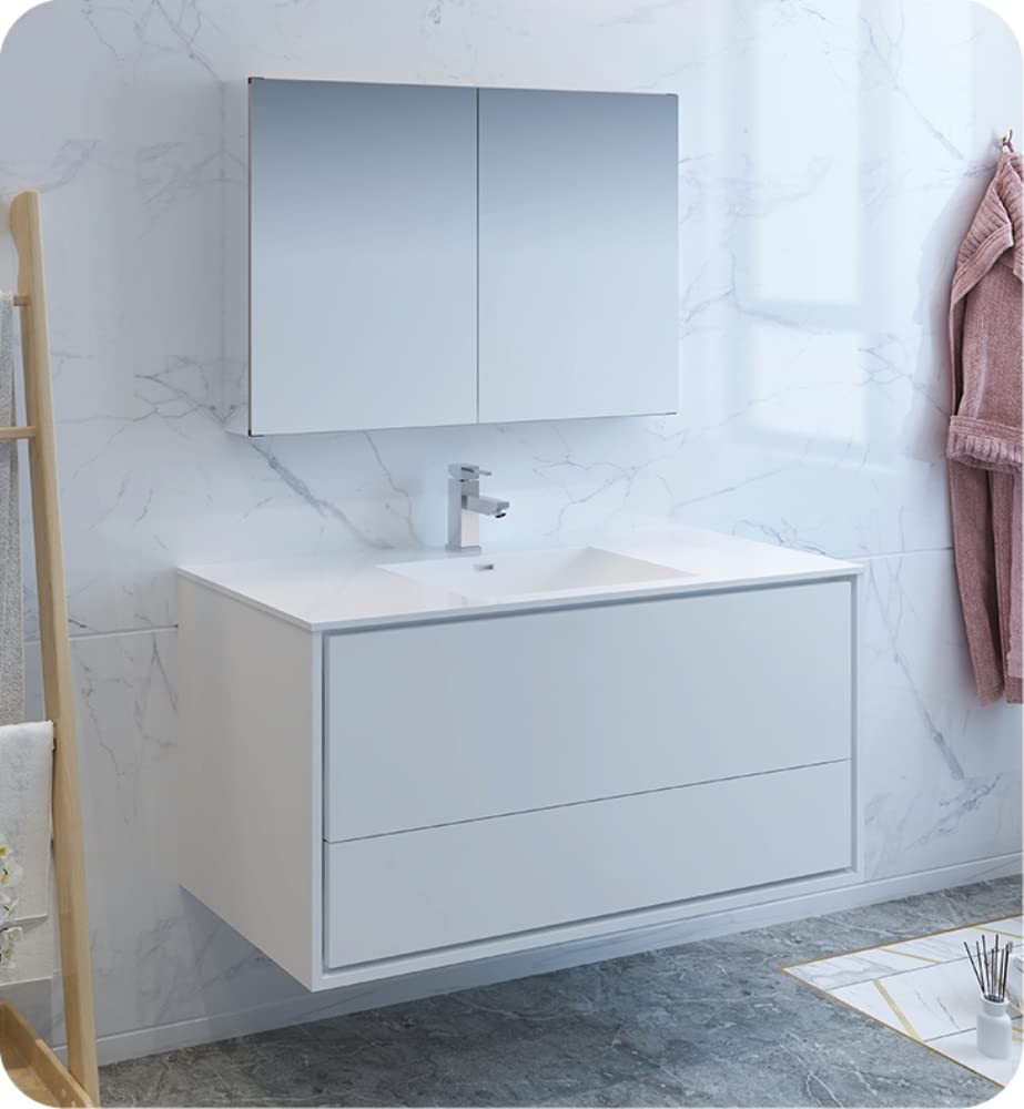 With its stylish White finish, the Fresca Catania Wall Hung Modern Bathroom Vanity adds a contemporary touch to any bathroom. Two spacious soft-closing metal frame drawers offer sensational storage space, perfect for keeping all of your daily essentials out of sight but within reach. The drawers feature push-release hardware, offering a streamlined front that beautifully complements the minimalist look. To make installation a breeze, the cabinet comes fully assembled and includes installation hardware. Gracing the top of the cabinet is an eye-catching white acrylic-resin countertop/sink with smooth edges and integrated overflow. The sink is designed for durability and style and has been pre-drilled to accommodate a single hole faucet (included). This vanity also comes with a fully mirrored medicine cabinet with two adjustable glass shelves, to complete the look. This lovely vanity is available in multiple colors and makes a stylish statement in any home.