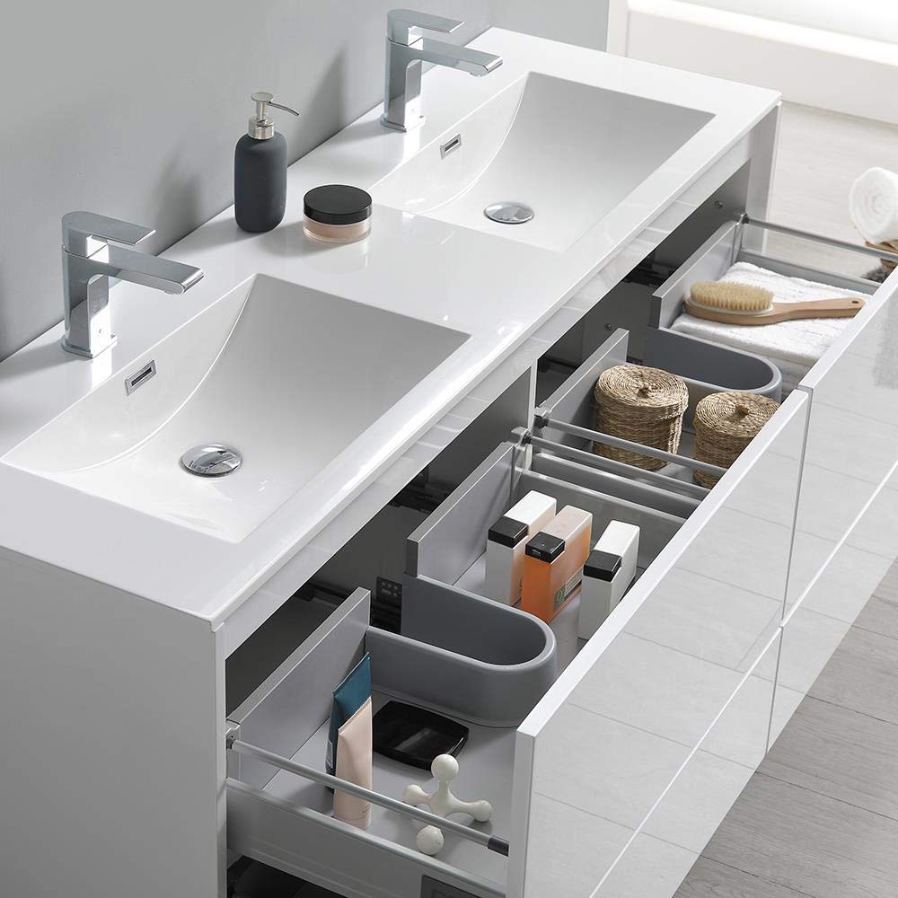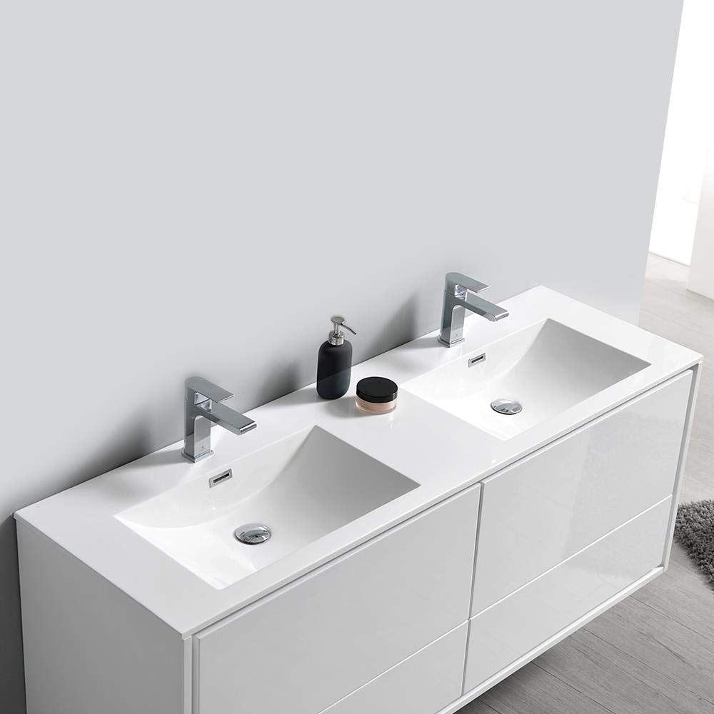 With its stylish White finish, the Fresca Catania Wall Hung Modern Double Sink Bathroom Vanity with Medicine Cabinet adds a contemporary touch to any bathroom. Four spacious soft-closing metal frame drawers offer sensational storage space for today's modern family. The drawers feature push-release hardware, offering a streamlined front that beautifully complements the minimalist look. Gracing the top of the cabinet is an eye-catching white acrylic-resin countertop/double sink with smooth edges and integrated overflow. The sinks are designed for durability and style and have been pre-drilled to accommodate single hole faucets (included). This lovely cabinet is available in multiple sizes and finishes. To make installation a breeze, it comes fully assembled and includes installation hardware. This vanity also comes with a fully mirrored three-door medicine cabinet with four adjustable glass shelves, to complete the look.