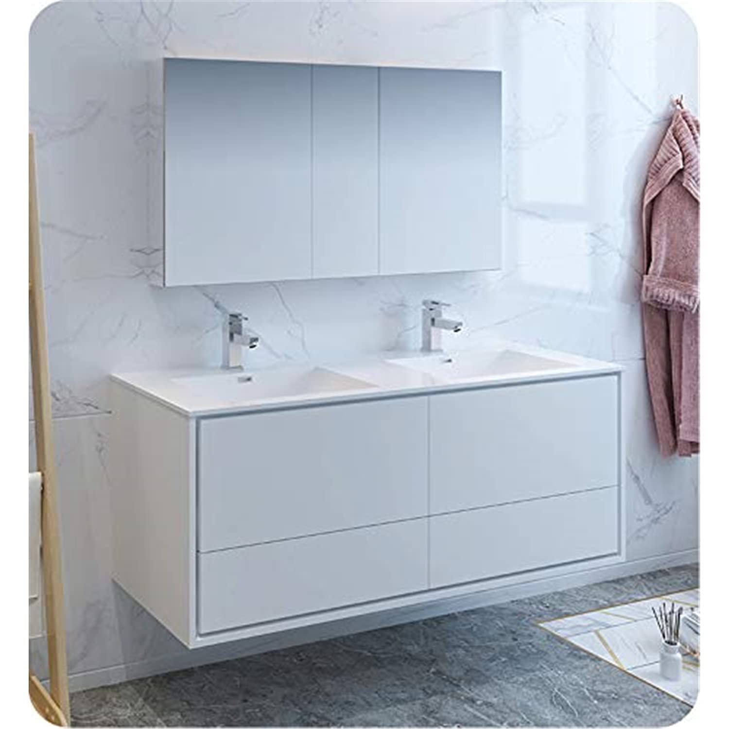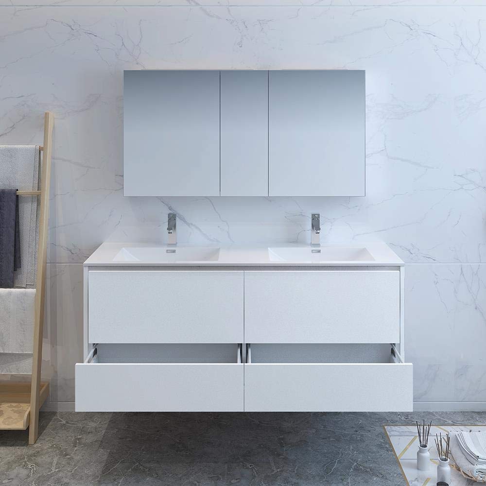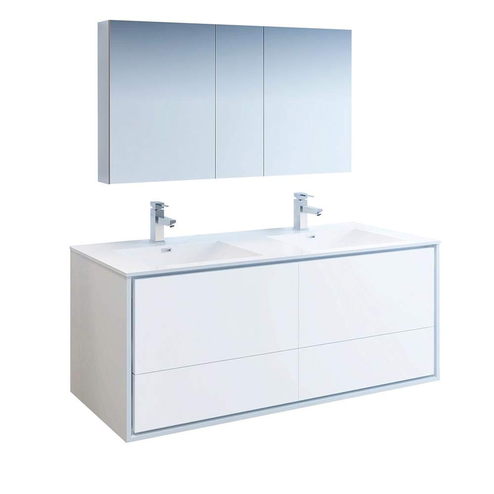 Fresca FVN9260WH-D Fresca Catania 60" Glossy White Wall Hung Double Sink Modern Bathroom Vanity w/ Medicine Cabinet