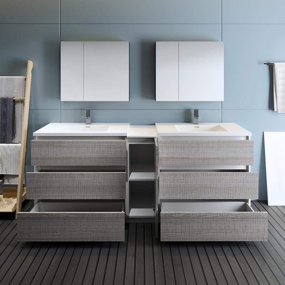 With its chic Ash Gray finish, the Fresca Lazzaro Freestanding Modern Double Sink Bathroom Vanity is the ideal combination of style and function. It features a center cabinet with two roomy compartments and six spacious soft-closing wood drawers, ideal for storing and organizing all of your daily essentials. The door and drawers feature push-release hardware, creating a streamlined front that beautifully complements the minimalist design. Gracing the top of the cabinet is an eye-catching white acrylic-resin countertop/double sink with smooth edges and integrated overflow. The sinks are designed for durability and style and have been pre-drilled to accommodate single hole faucets (included). This vanity also comes with two fully mirrored medicine cabinets. Each features two adjustable glass shelves. This vanity is available in multiple colors and makes a stylish statement in any home.