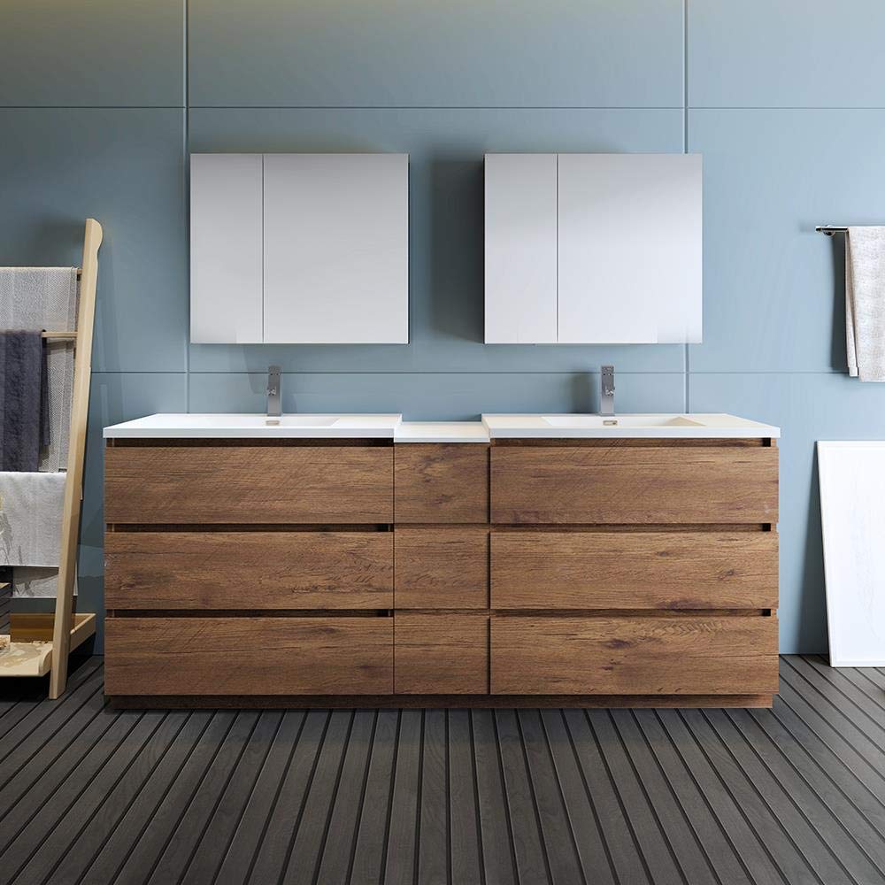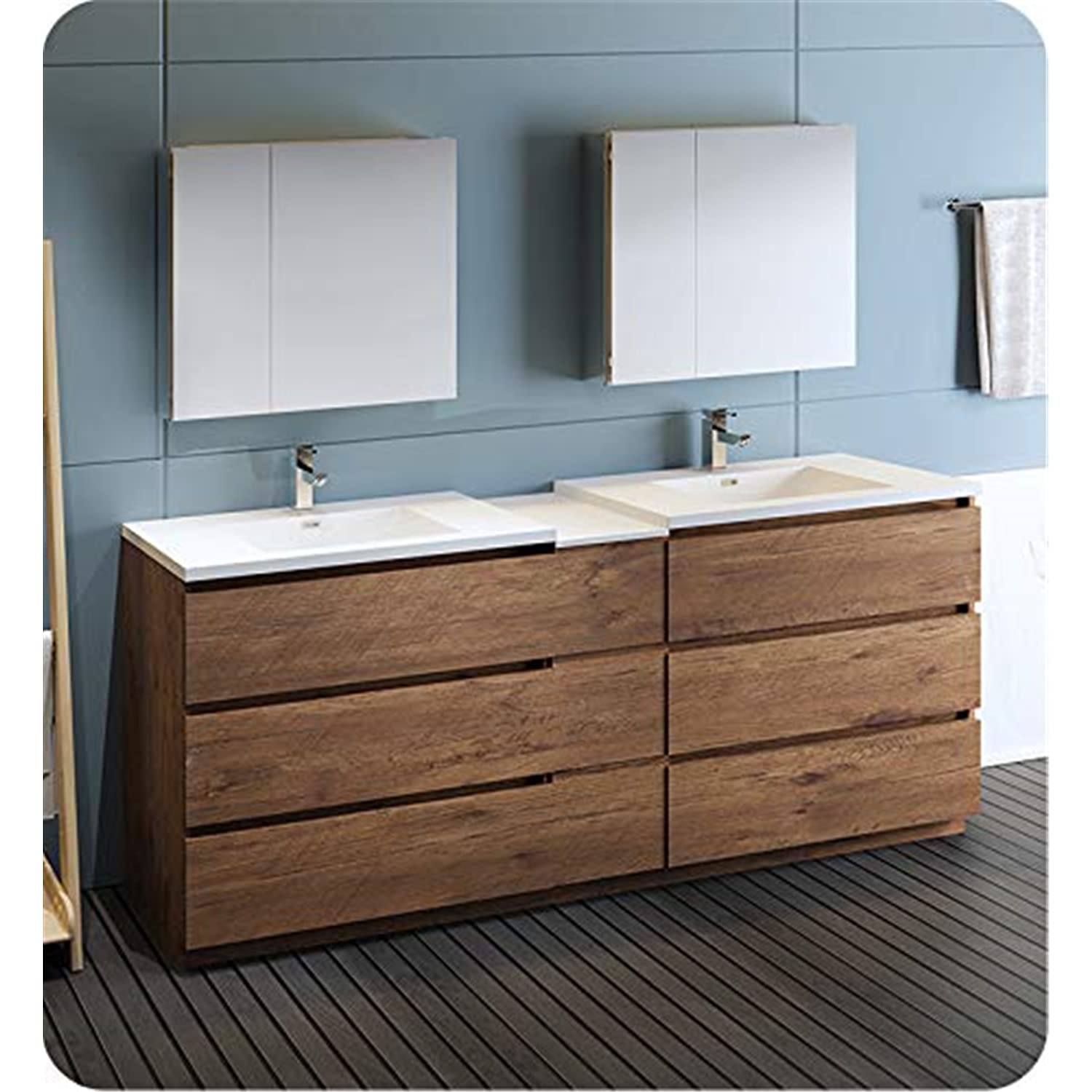 With its chic Rosewood finish, the Fresca Lazzaro Freestanding Modern Double Sink Bathroom Vanity is the ideal combination of style and function. It features a center cabinet with two roomy compartments and six spacious soft-closing wood drawers, ideal for storing and organizing all of your daily essentials. The door and drawers feature push-release hardware, creating a streamlined front that beautifully complements the minimalist design. Gracing the top of the cabinet is an eye-catching white acrylic-resin countertop/double sink with smooth edges and integrated overflow. The sinks are designed for durability and style and have been pre-drilled to accommodate single hole faucets (included). This vanity also comes with two fully mirrored medicine cabinets. Each features two adjustable glass shelves. This vanity is available in multiple colors and makes a stylish statement in any home.