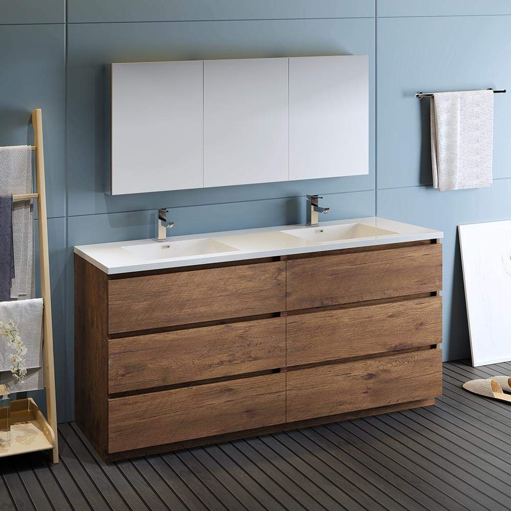 With its chic Rosewood finish, the Fresca Lazzaro Freestanding Modern Double Sink Bathroom Vanity is the ideal combination of style and function. Six spacious soft-closing wood drawers offer wonderful storage space, perfect for keeping all of your daily essentials out of sight and the family organized. The drawers feature push-release hardware, offering a streamlined front that beautifully complements the minimalist design. Gracing the top of the cabinet is an eye-catching white acrylic-resin countertop/double sink with smooth edges and integrated overflow. The sinks are designed for durability and style and have been pre-drilled to accommodate single hole faucets (included). This vanity also comes with a fully mirrored medicine cabinet with four adjustable glass shelves, to complete the look. This modern vanity is available in multiple colors and makes a stylish statement in any home.