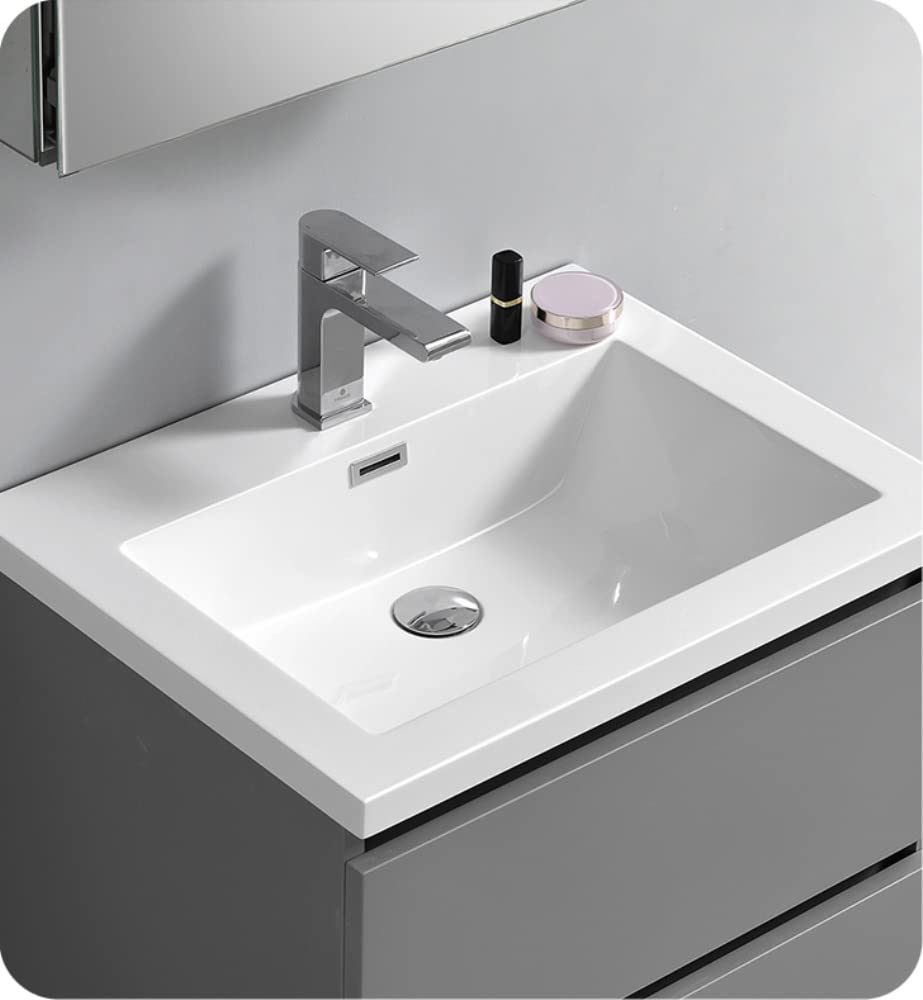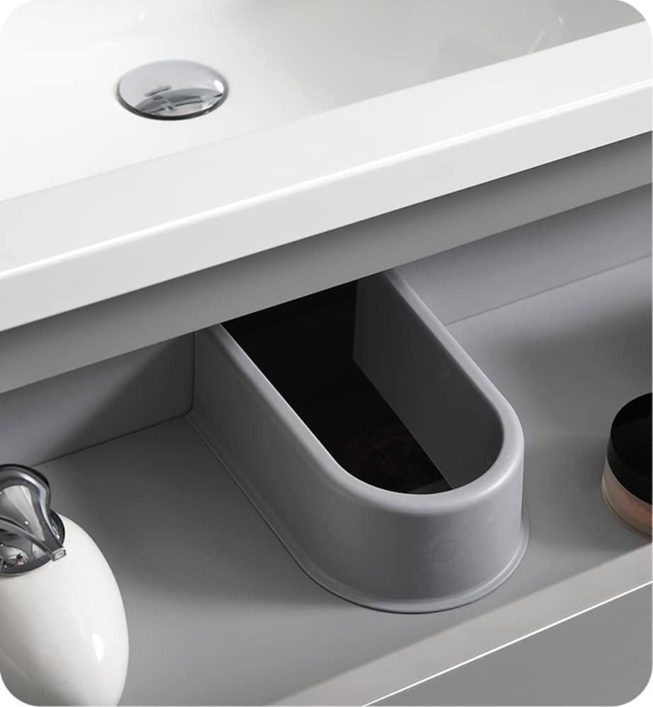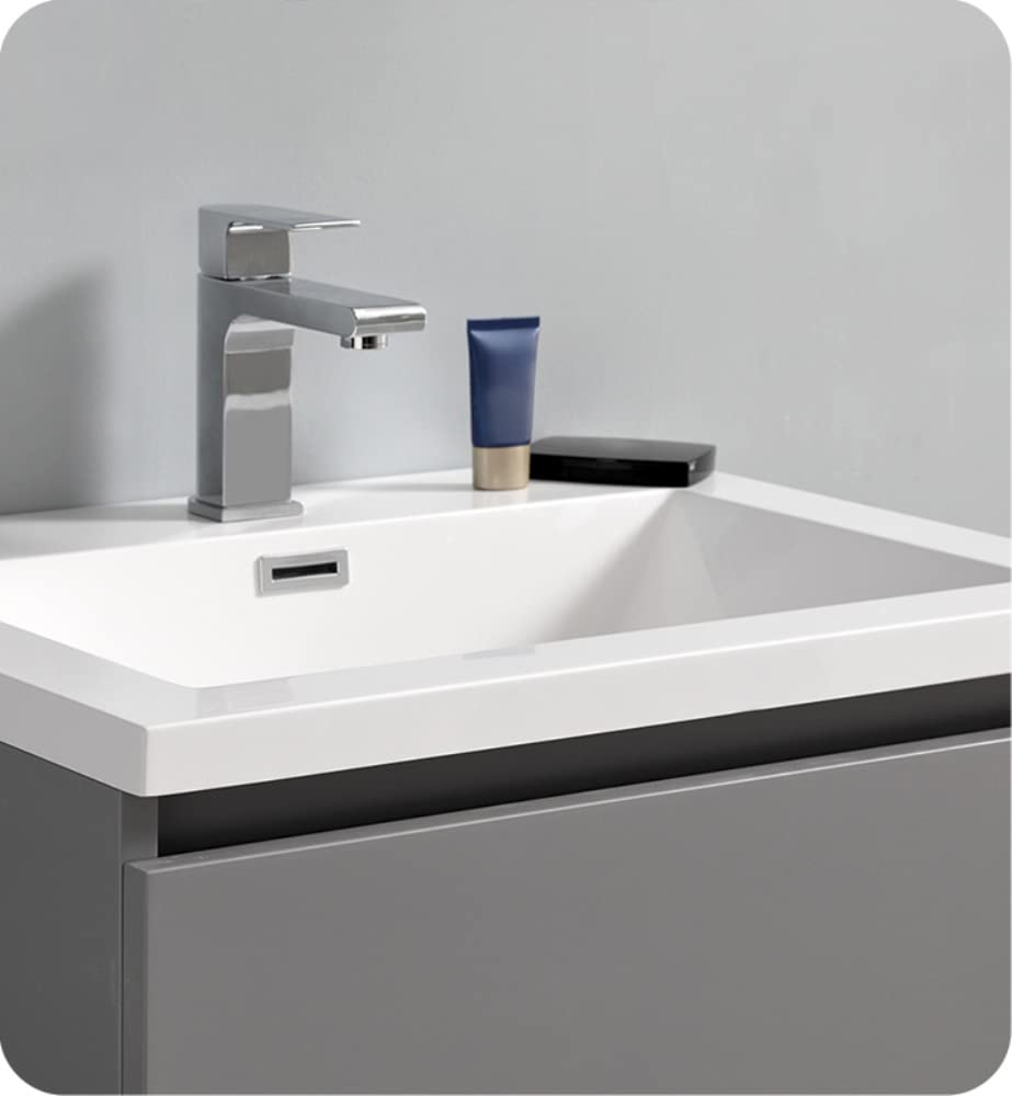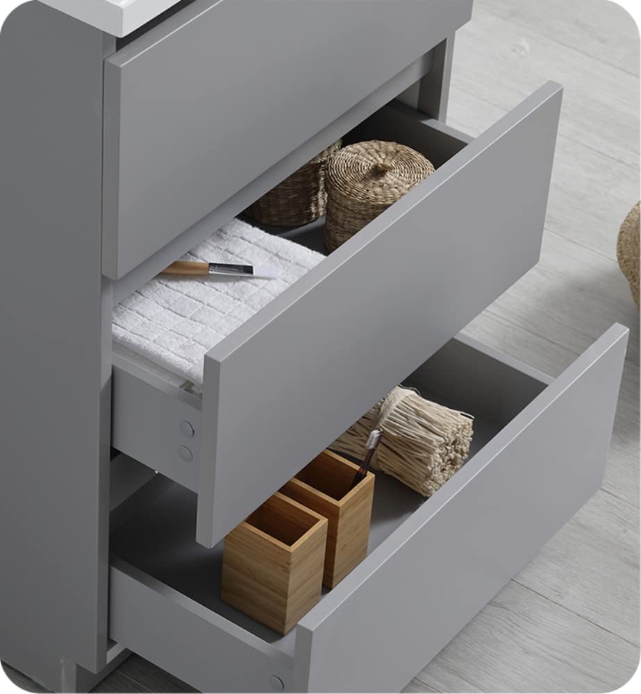 With its chic Gray finish, the Fresca Lazzaro Freestanding Modern Bathroom Vanity is the ideal combination of style and function. The cabinet offers great storage with soft-closing drawers, just perfect for organizing all of your daily essentials. The drawers feature push-release hardware, offering a streamlined front that beautifully complements the minimalist design. To make installation a breeze, the cabinet comes fully assembled and includes installation hardware. Gracing the top of the cabinet is an eye-catching white acrylic-resin countertop/sink with smooth edges and integrated overflow. The sink is designed for durability and style and has been pre-drilled to accommodate a single hole faucet (included). This vanity also comes with a fully mirrored medicine cabinet with two adjustable glass shelves, to complete the look. This modern vanity is available in multiple colors and makes a stylish statement in any home.
