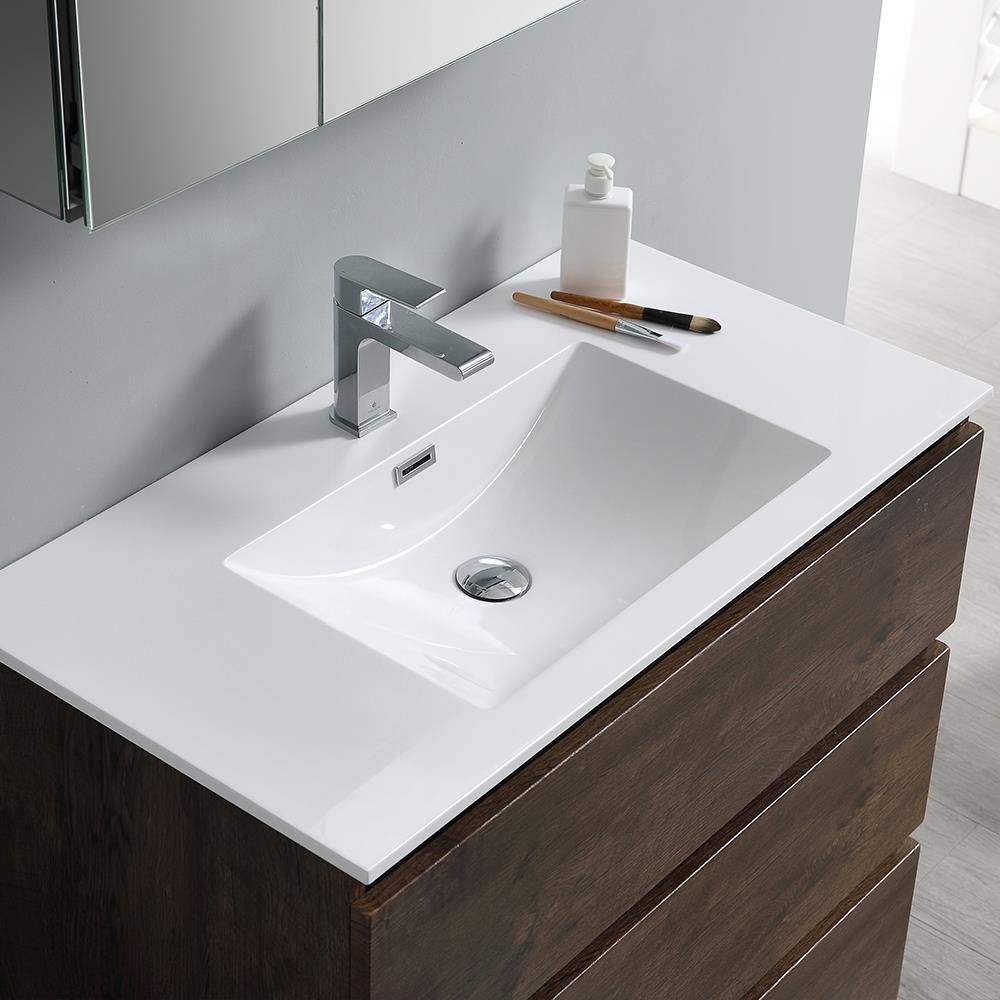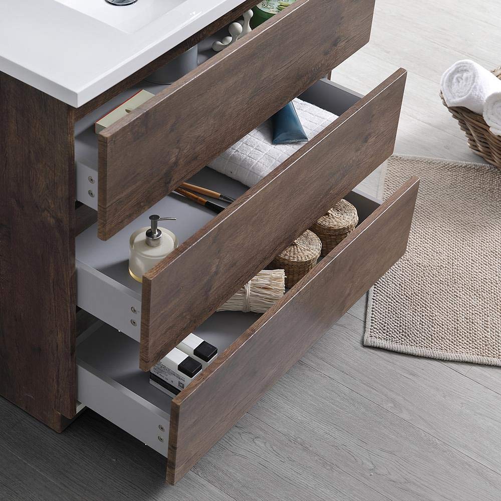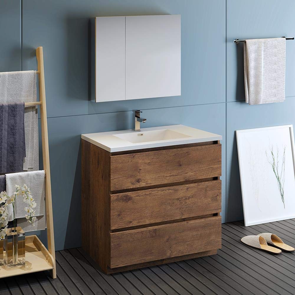 With its chic Rosewood finish, the Fresca Lazzaro Freestanding Modern Bathroom Vanity is the ideal combination of style and function. The cabinet offers great storage with soft-closing drawers, just perfect for organizing all of your daily essentials. The drawers feature push-release hardware, offering a streamlined front that beautifully complements the minimalist design. To make installation a breeze, the cabinet comes fully assembled and includes installation hardware. Gracing the top of the cabinet is an eye-catching white acrylic-resin countertop/sink with smooth edges and integrated overflow. The sink is designed for durability and style and has been pre-drilled to accommodate a single hole faucet (included). This vanity also comes with a fully mirrored medicine cabinet with two adjustable glass shelves, to complete the look. This modern vanity is available in multiple colors and makes a stylish statement in any home.
