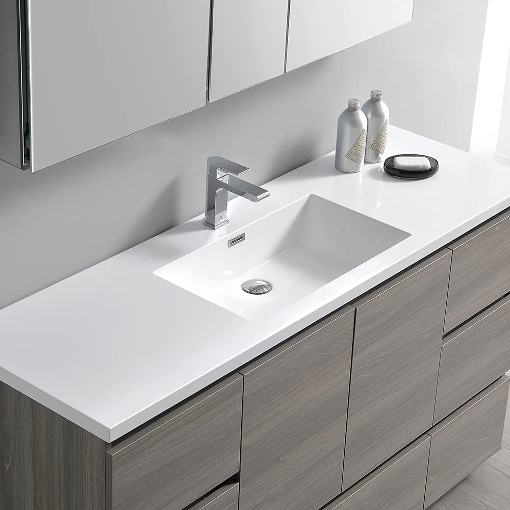 With its chic Gray Wood finish, the Fresca Lazzaro Freestanding Modern Bathroom Vanity is the ideal combination of style and function. Measuring 60” in width, this freestanding bathroom cabinet offers elegant simplicity and superior storage. Spacious soft-closing wood drawers can hold all of your bathroom essentials, while a roomy under-the-sink compartment provides additional space for tucking away towels or storage baskets. The drawers and doors feature push-release hardware, offering a streamlined front that beautifully complements the minimalist design. Gracing the top of the cabinet is an eye-catching white acrylic-resin countertop/sink with smooth edges and integrated overflow. The sink is designed for durability and style and has been pre-drilled to accommodate a single hole faucet (included). This vanity also comes with a fully mirrored medicine cabinet with four adjustable glass shelves, to complete the look. This modern vanity is available in multiple colors and makes a stylish statement in any home.