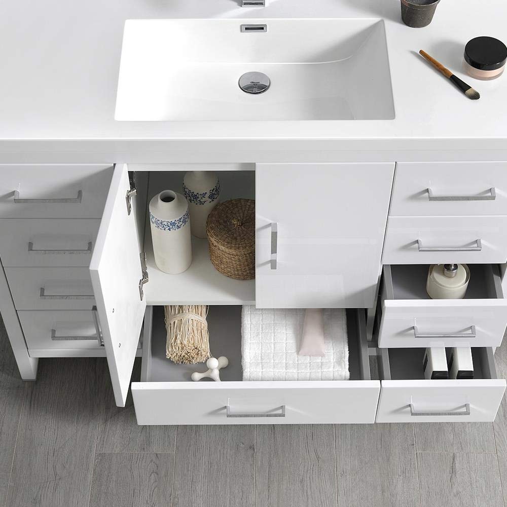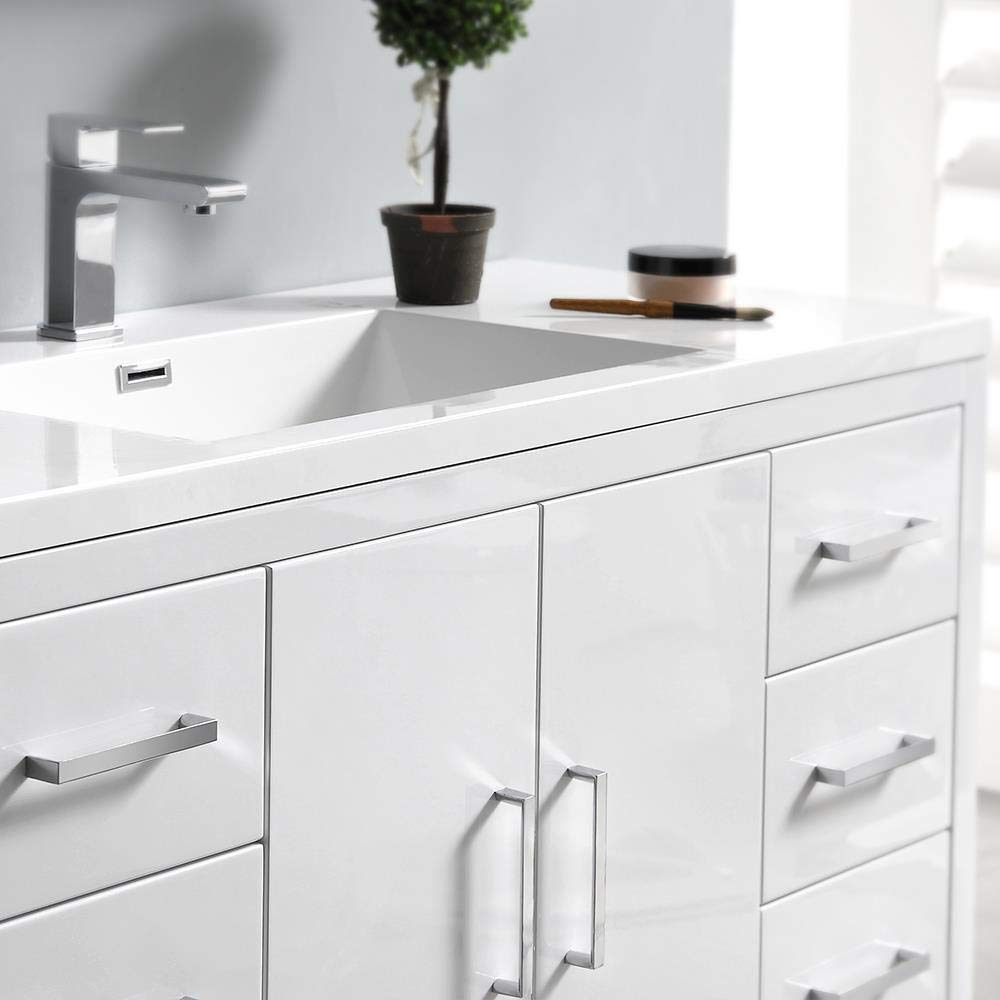 With its elegant White Gloss finish, the Fresca Imperia Freestanding Modern Bathroom Cabinet with Integrated Sink is the perfect complement to a contemporary space. Two doors open to reveal a large storage area for keeping toiletries, towels or other bathroom essentials handy. Theres a roomy drawer beneath it and eight deep side drawers that can easily accommodate the needs of an entire family. The doors and drawers are fitted with top quality hardware offering soft-closing operation. Polished bar-style chrome handles add to the chic design. Gracing the top of the cabinet is an eye-catching white acrylic-resin countertop/sink with smooth edges and integrated overflow. The sink is designed for durability and style and has been pre-drilled to accommodate a single hole faucet (included). This vanity also comes with a fully mirrored medicine cabinet with two adjustable glass shelves, to complete the look. This modern vanity is available in multiple sizes and makes a stylish statement in any home.