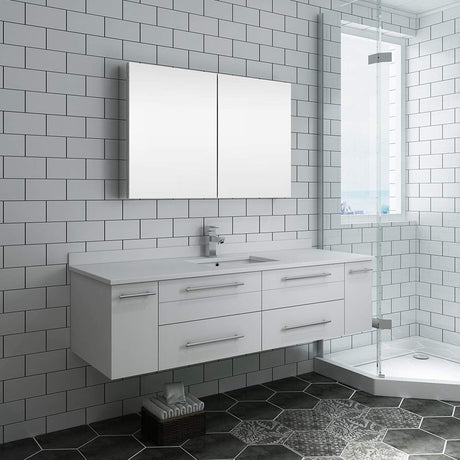 Regular price $2,59995UnavailableIn stock online (9 Units)Fresca FVN6160WH-VSL Fresca Lucera 60" White Wall Hung Single Vessel Sin...