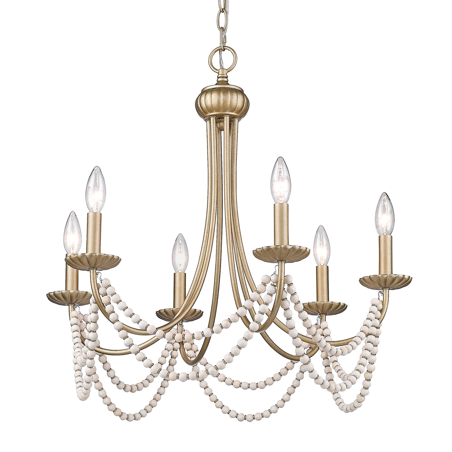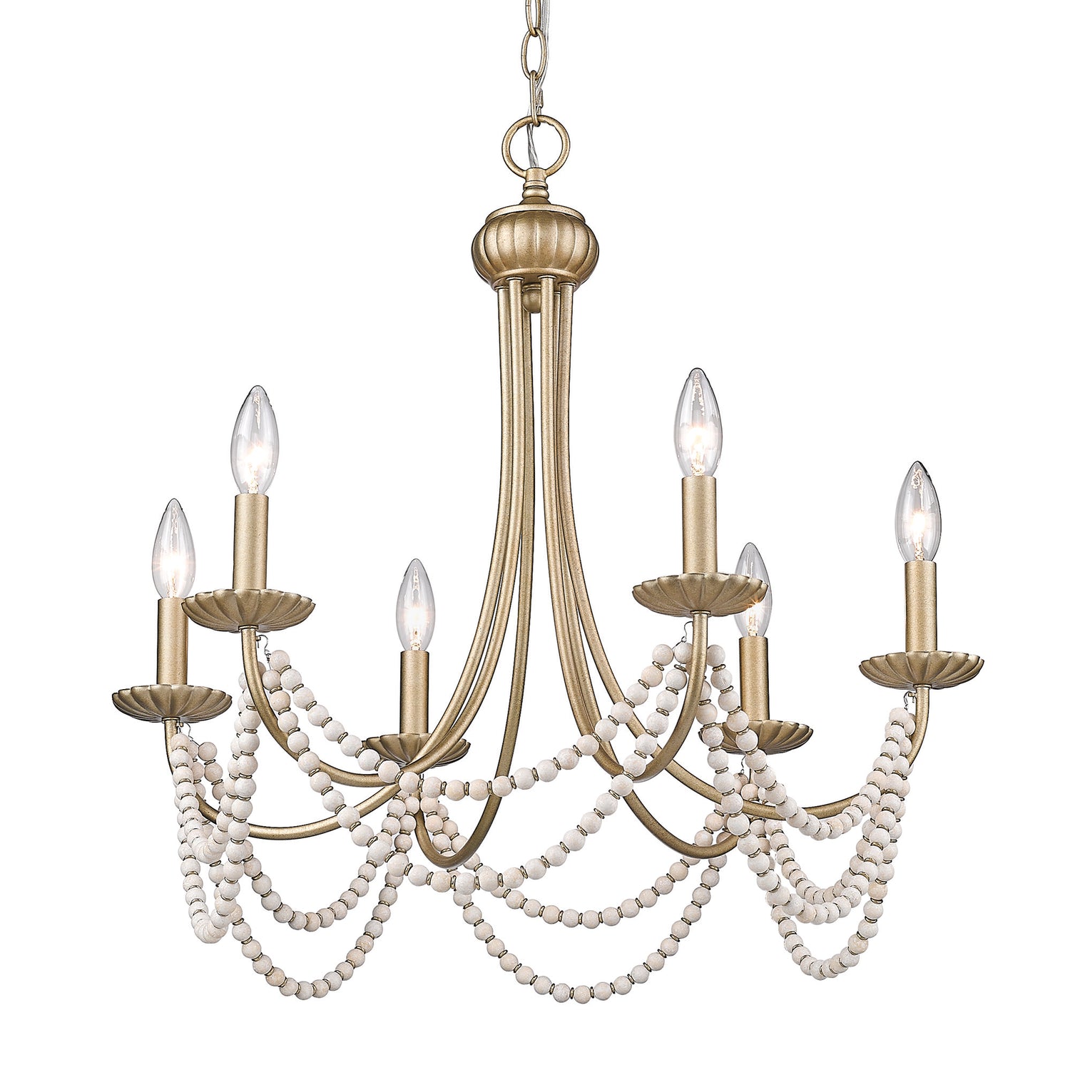 Dress up your home with the traditional and eclectic Serafina. The Golden Aura finish is layered with soft gold over silver undertones to give the graceful arms a glamorous, vintage feel. Enhancing the elegance of the glowing candelabras, casual white wooden beads drape the fixture's silhouette.