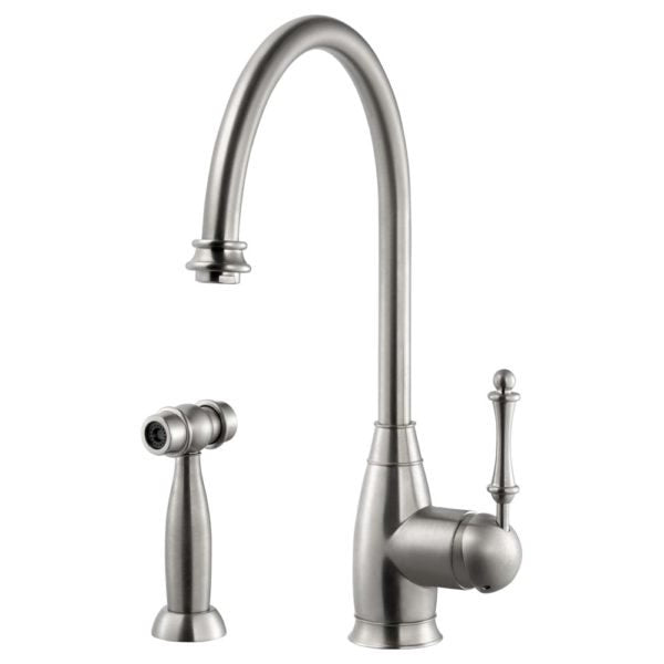 Traditional brass single lever kitchen faucet with high rotating spout and integral side spray.