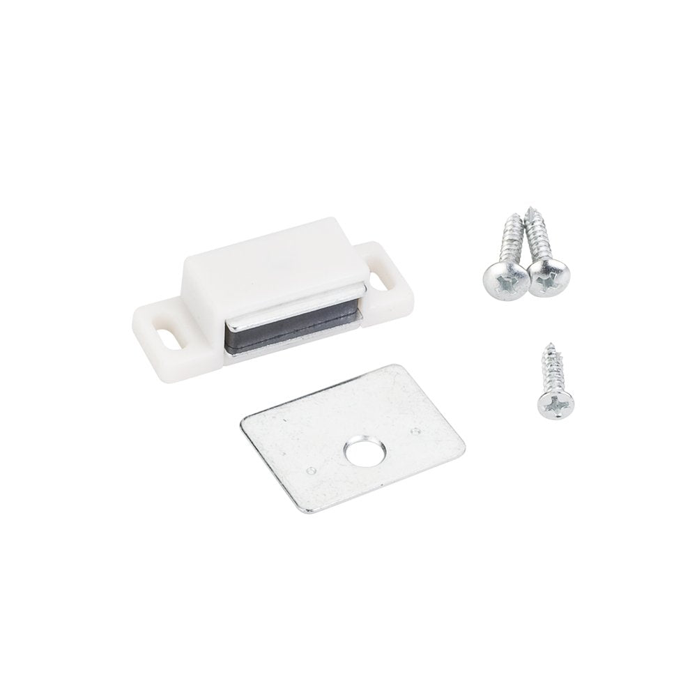 15lb Single Magnetic Catch White/Zinc Retail Pack. Polybagged with 1 Catch, 1 Strike Plate, 1 #5x5/8" Flat Head Screw, and 2 #6x3/4" Pan Head Screws.