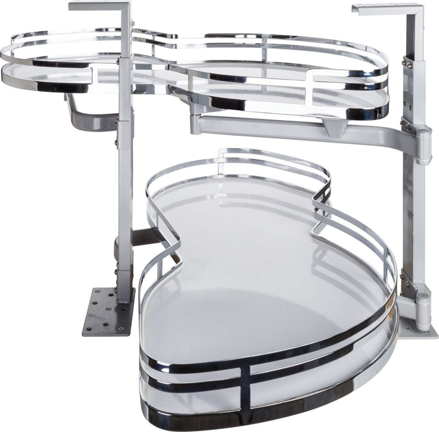 15" Blind Corner Swing Out Right Handed Unit. Minimum Opening 16-1/2" for Frameless or 15" for Face Frame Cabinets. White Laminated Non-slip Shelves with Chrome Edging