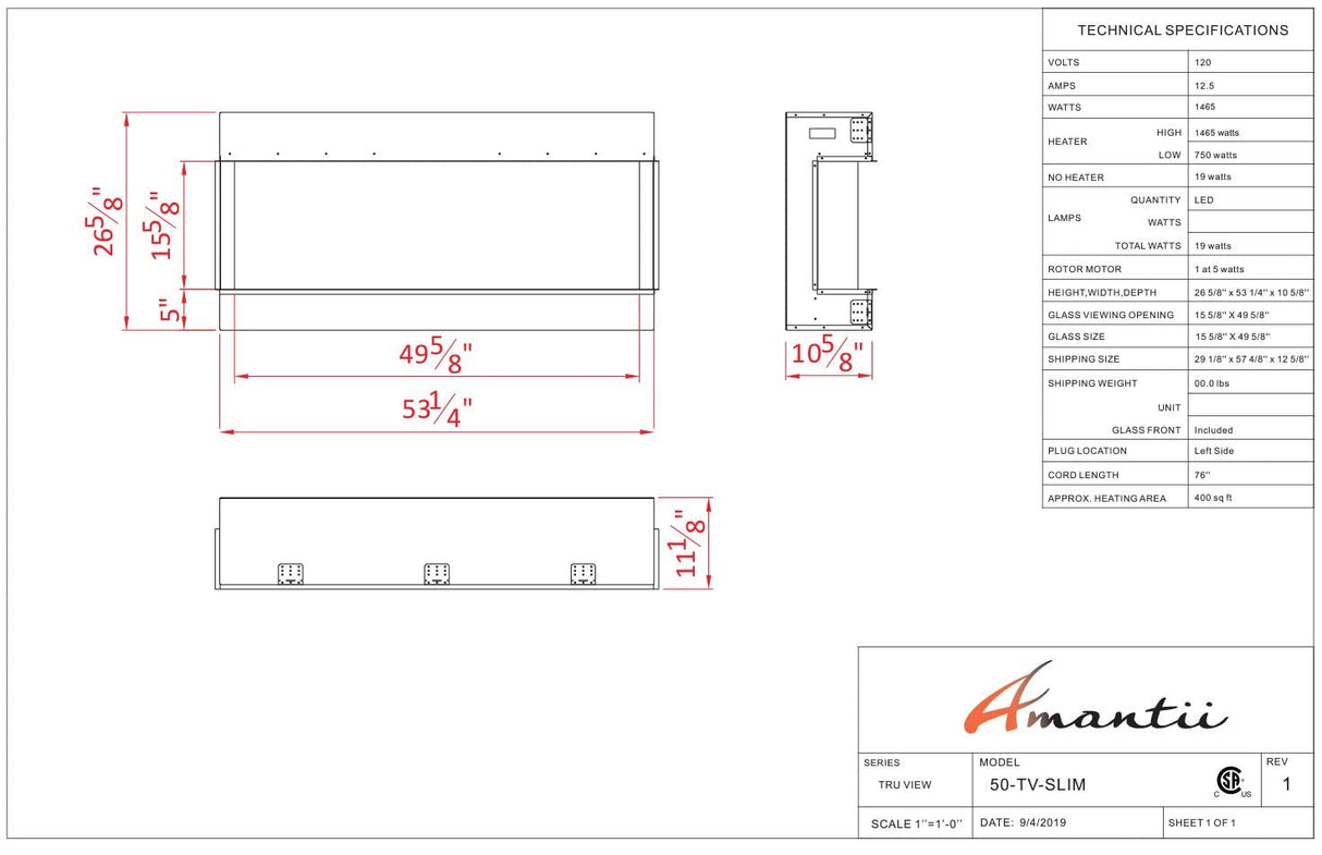 The Series Slim Built-in 3-Sided Electric Fireplace with Logs (50-TRV-SLIM), 50-Inch provides a premium electric fireplace option for your home or business. The Tru-View series slim units feature a required installation depth of only four inches, allowing for installation into a 2x4-inch wall--perfect for when space is at a premium. The adjustable ambient LED canopy lighting adds a captivating touch to your room, while the cutting-edge flame presentation allows for effortless color changes. This electric fireplace includes a 10-piece log set, charcoal grey fire glass, black fire glass and vermiculite to further enhance the appearance of the firebox. This fireplace features an integrated heater capable of producing up to 4,800 BTU--enough warmth to zone heat a space up to approximately 500 square feet. Additionally, the unit's flames can be used with or without heat for year-round enjoyment. An included multi-function remote provides convenient control to round out an impressive feature set sure to enhance the ambiance of your home. As an added bonus, this unit is approved for both indoor and outdoor use.Trv View Slim Smart Electric - 50" Indoor / Outdoor WiFi Enabled 3 Sided Fireplace Featuring a depth of 10 5/8", MultiFunction Remote Control, Multi Speed Flame Motor, and a 10 piece Birch Log Set