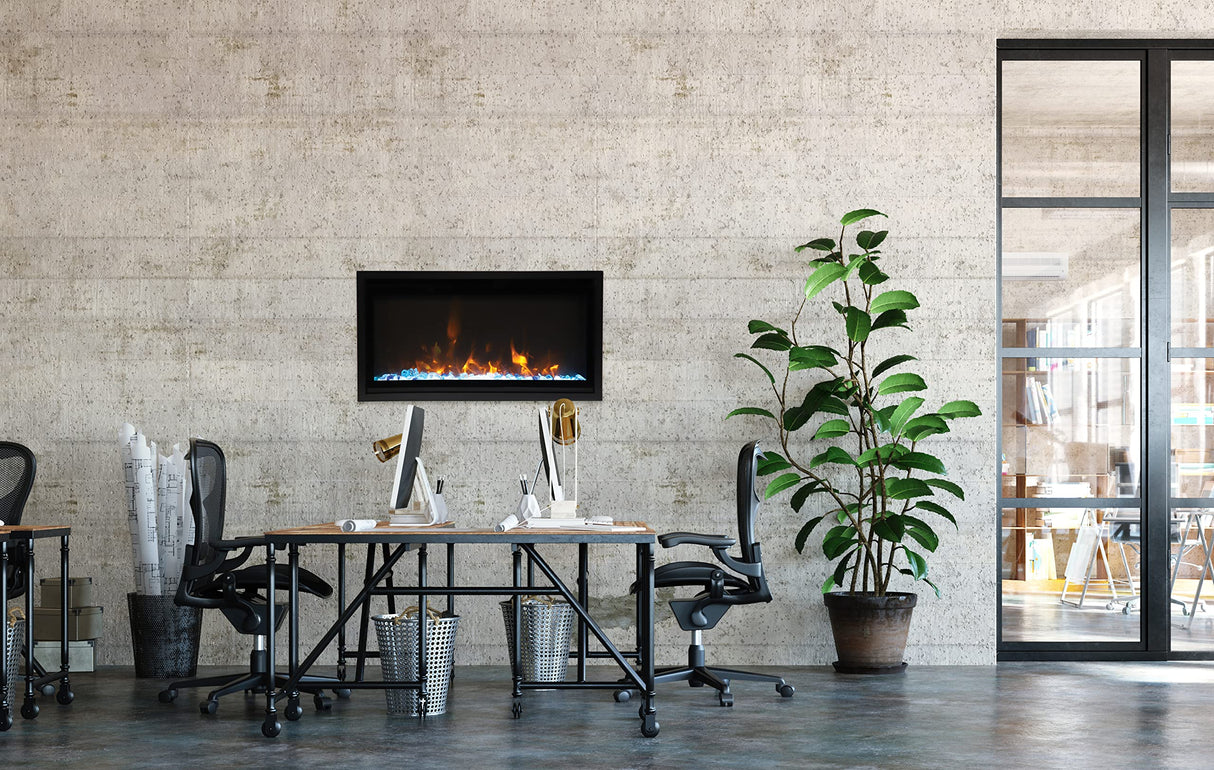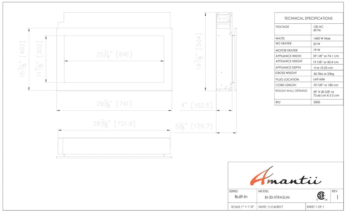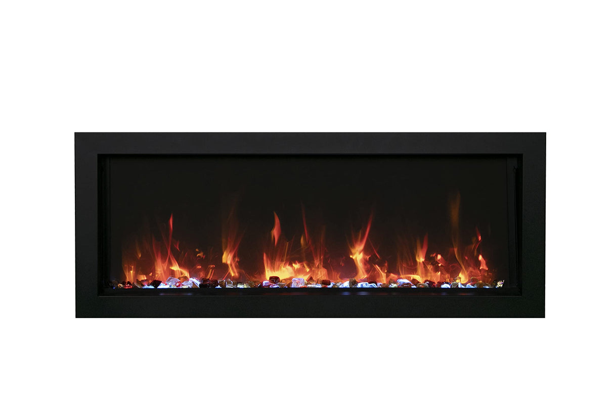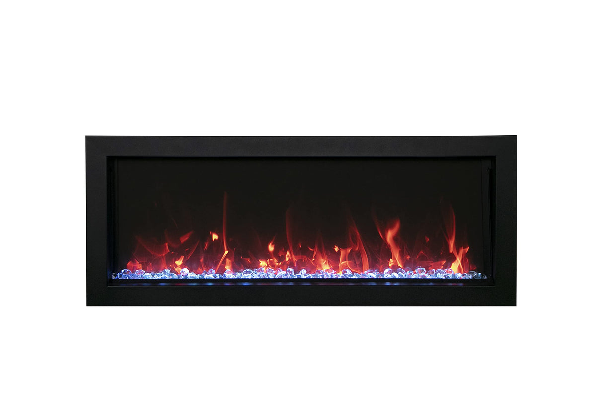 The Panorama Indoor/Outdoor Extra Slim Built In Electric Fireplace (BI-30-XTRASLIM), 30-Inch provides a premium heating alternative to a wood or gas fireplace. The Panorama Extra Slim series is an instant upgrade for any space and features an outdoor-compatible design for installation flexibility. The adjustable ambient LED canopy lighting adds a captivating touch to your room, while the cutting-edge flame presentation allows for effortless color changes. Enhance the flames with the included clear fire glass decorative media. Additional features such as an integrated 5,000 BTU heater and remote control add to an already impressive package. Furthermore, with the convenience of WiFi-enabled Smart technology, you can have ultimate control over the fireplace right from your smartphone. Enjoy the comfort of a fireplace without the hassle and cost of gas or wood when you add an Amantii electric fireplace to your home.Panorama Xtraslim Full View Smart Electric - 30" Indoor /Outdoor WiFi Enabled Fireplace, featuring a MultiFunction Remote, Multi Speed Flame Motor, Glass Media & a Black Trim