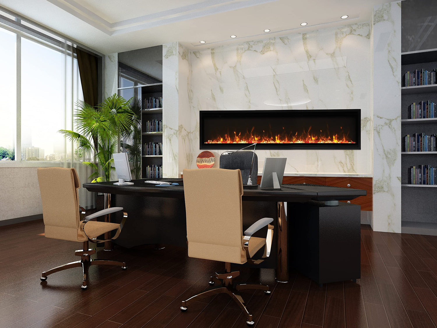 The Amantii 60" Outdoor Panorama Series electric fireplace provides a great alternative to gas or wood burning fireplaces, with a modern look - don't fret the hassle of challenging installations and enjoy immediate gratification with a simple install. Designed to be built in, the BI-60-SLIM features a 6" slim fire box and offers a true clean face installation - allowing you to bring the drywall right up to the face, an instant upgrade for any room. Included with this Amantii fireplace are the large glass chunks, unique Ice Glass media, the (6) piece LED ember log set, and optional black steel surround. Enjoy the comfort of a fireplace without the hassle and cost of gas or wood, and benefit from the slim and sleek design of the Amantii BI-60-SLIM electric fireplace. Features: Outdoor rated design provides long term durability and ambiance for any outdoor space Low profile design allows a true built in application, allowing drywall or finishing to be built into the glass for a clean face and sleek look Three stage heater vents from the face, and a built in fan circulates heat throughout the room; up to 400 - 500 square feet Includes remote control for fireplace heater, flame, and backlighting; also includes optional black glass surround Large fire glass chunks and unique clear and blue diamond shaped glass included Flame operates with or without heat Specifications: Face Dimensions: 15.75" x 59.125"(Height x Width) Viewing Area: 12" x 55.25"(Height x Width) Firebox Dimensions: 15.75" x 59.125" x 6"(Height x Width x Depth) 120 Volts; 12.5 Amps; 1500 Watts, max Cord length: 76" Face venting heat Shipping weight: 124 lbs Downloads: Tech Specs Panorama Series Features Product Manual Full Product Brochure About Amantii: For more than three decades, Amantii has been innovating and expanding the fireplace and heating market with a growing product line. As a competitive and dynamic business, Amantii is able to offer a full line of contemporary,...Panorama Slim Full View Smart Electric - 60" Indoor /Outdoor WiFi Enabled Fireplace, featuring a MultiFunction Remote, Multi Speed Flame Motor, Glass Media & a Black Trim