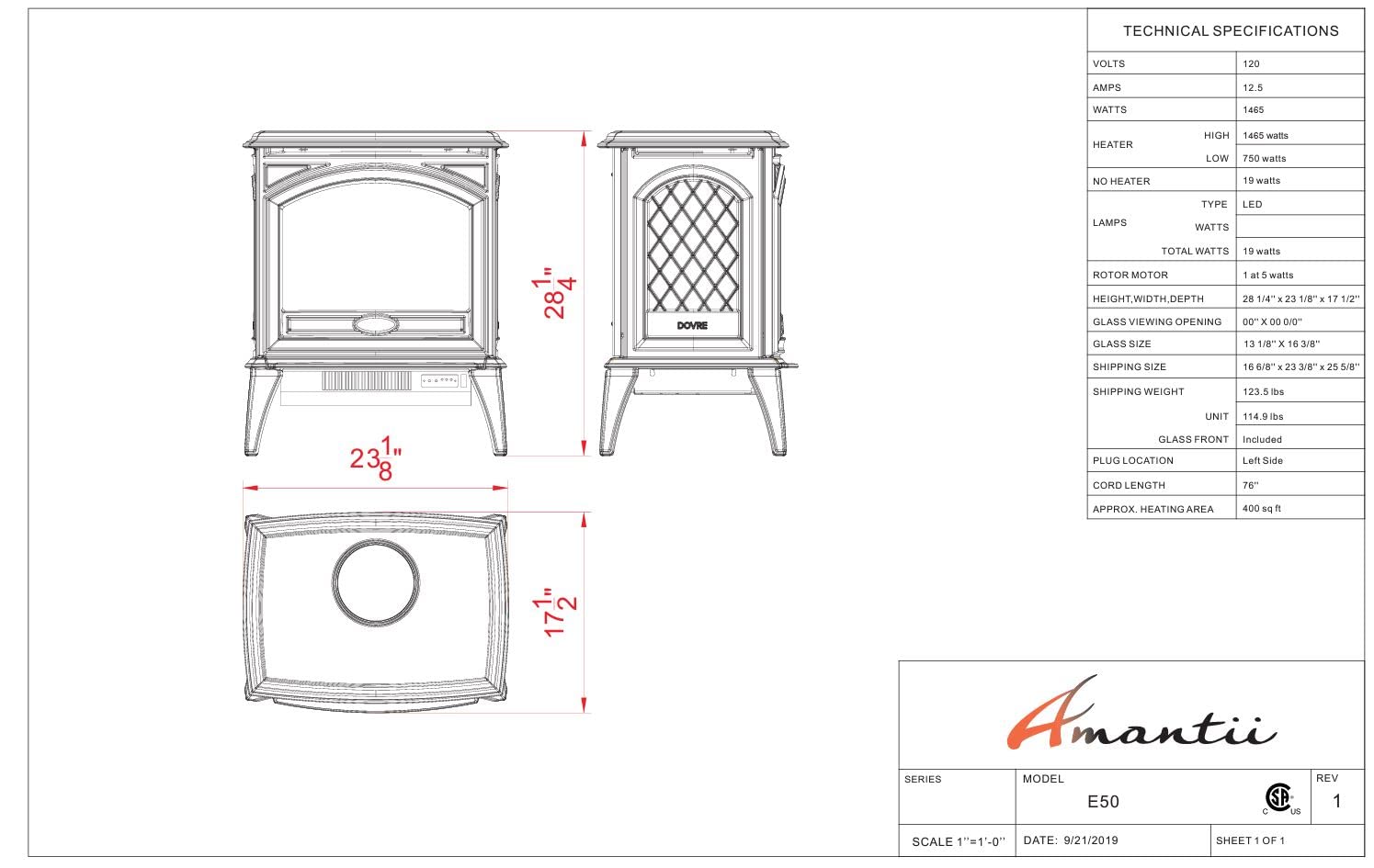 Amantii E50-NA Lynwood Series - 50 cm Freestand Electric Stove Featuring a Cast Iron Frame and a 10 Piece Birch Log Set