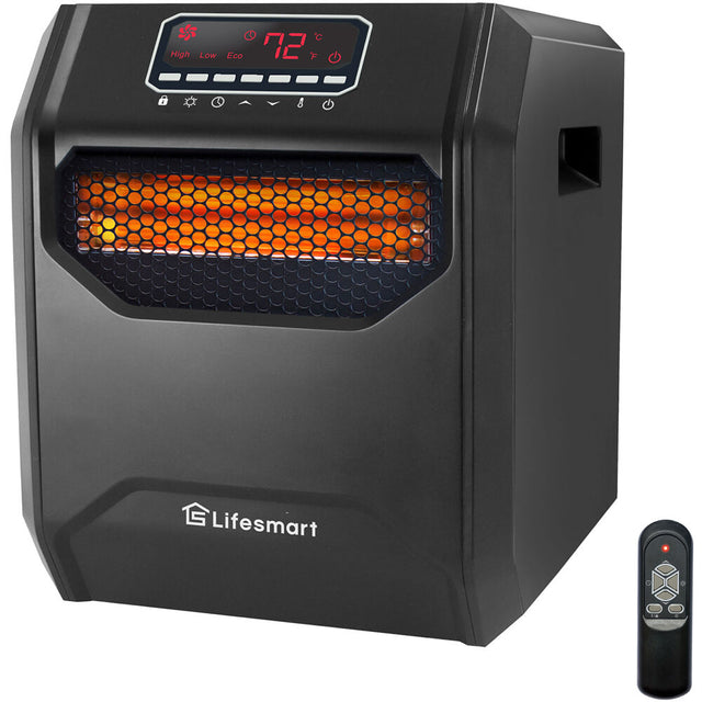 The Lifesmart 6-Element Infrared Heater offers comfort for any room in the home. Six infrared heating elements provide even heat distribution, without drying out the room. Features include three heat settings, which include the energy-saving ECO mode, programmable timer, and temperature, all easily operated from the unit's control panel or remote control (AAA-batteries not included). The cabinet design provides several safety capabilities such as a cool to the touch design, overheat shutoff and tip-over switch. Rolling casters make it effortless to bring comfort into any room in your home.