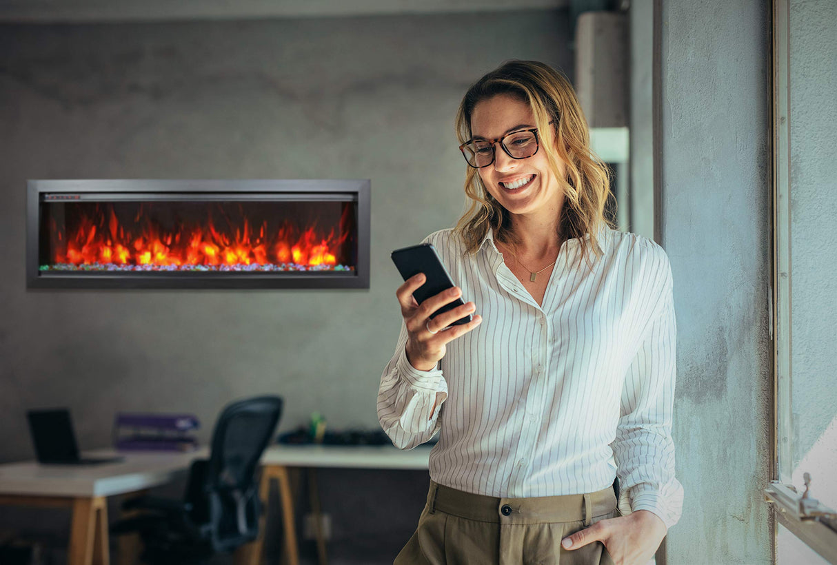 The WiFi app allows for control of fireplace functions including sound, programmable timers and control of the flame height and speed.