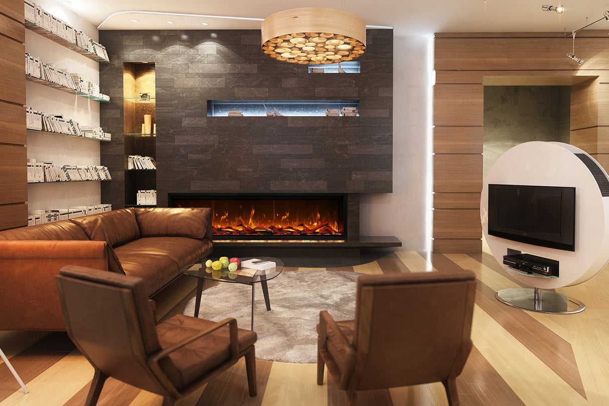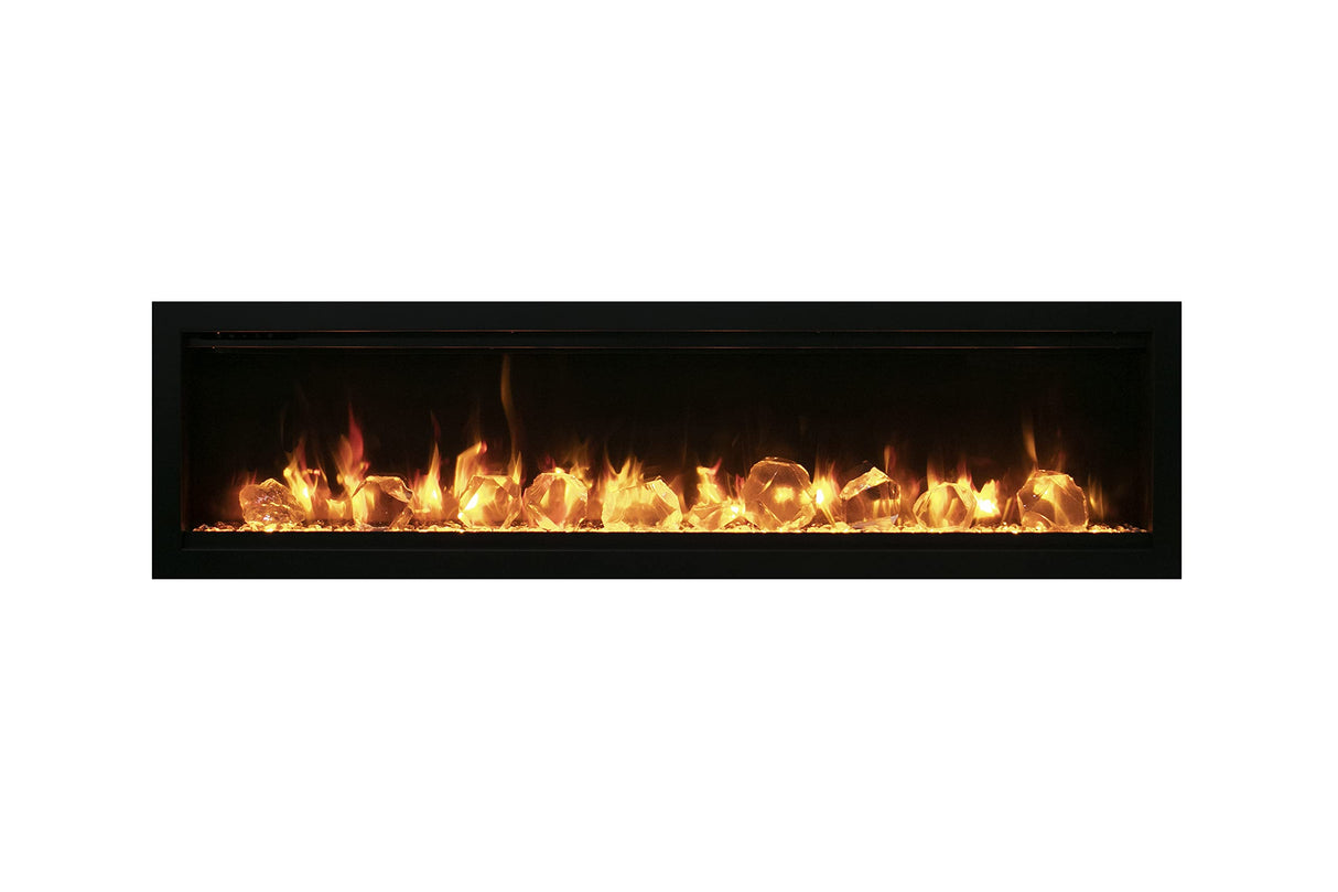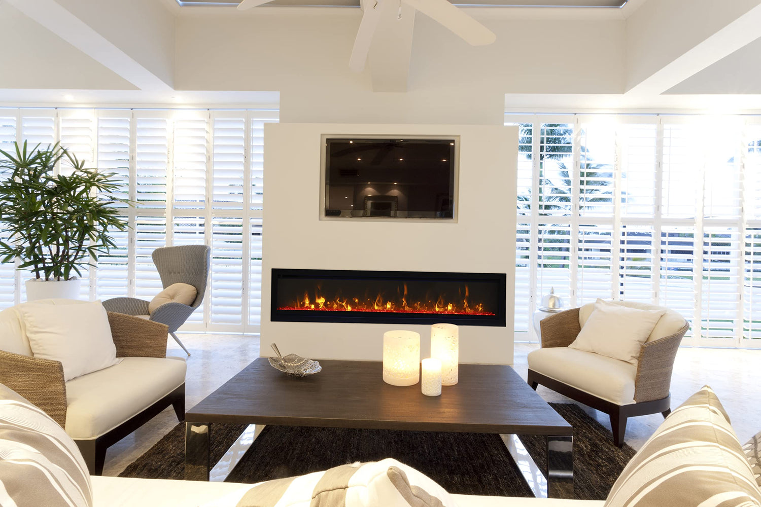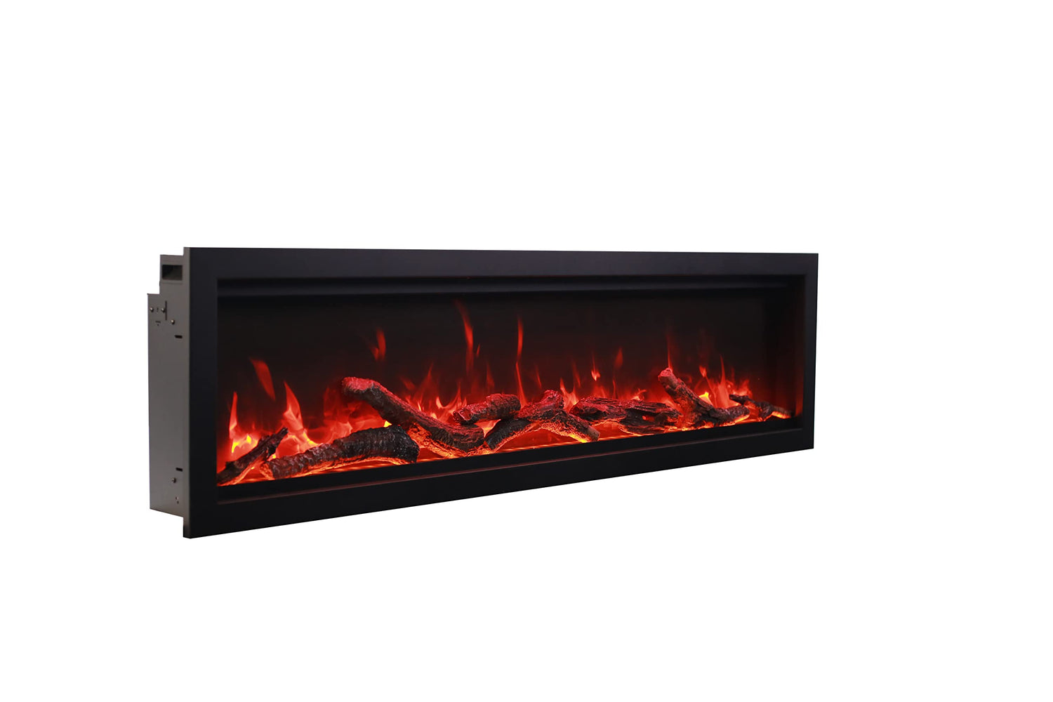 Amantii SYM-74 Electric Fireplace -74” Wide Indoor / Outdoor WiFi enabled electric fireplace, featuring a multi function remote control, multi speed motor and a 10 piece birch log set.