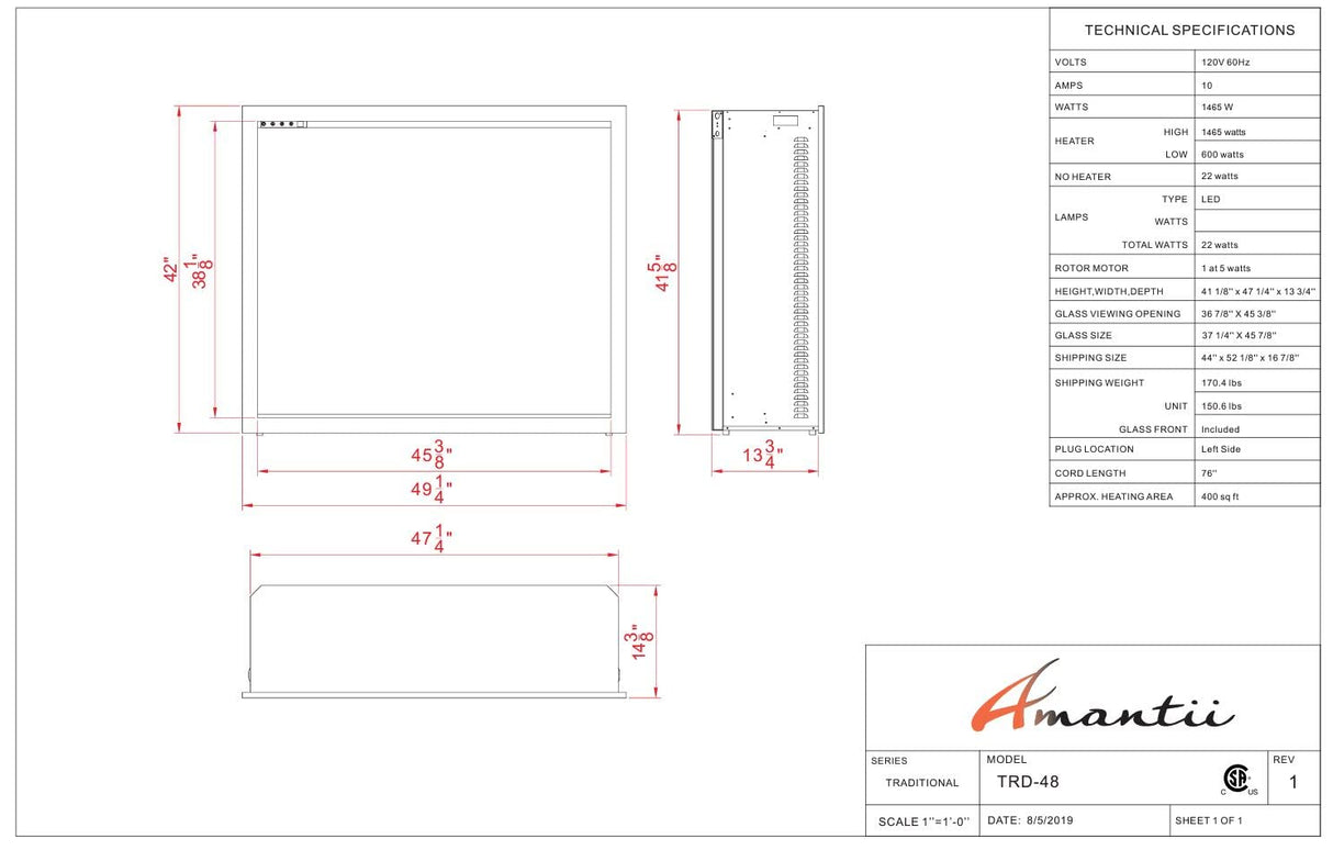 TRD-48 Traditional Series Electric Fireplace. MODERN TECHNOLOGY WITH CLASSIC INSERT FEATURES. The impressive and stylish TRD-48 electric fireplace, part of the Amantii Traditional Series, takes inspiration by it’s timeless yet elegant style and exceptional quality. The TRD-48 is stunning in any room. The heater and vents are concealed in the inner top of the unit and allows for a true clean appearance. Enjoy the brilliant flames of your TRD-48 traditional fireplace, even while the heat is off, for ambiance during every season. This timeless 48 inch electric fireplace will allow you to breathe new life into any space while adding warmth and ambiance to the room. FEATURES - Rated for indoor applications only. State of the art Fire and Ice flame set- with a click of the remote change the flame from traditional colors such as orange to more contemporary blue, purple, rose and violet colors. Can produce up to 1200W 4096 BTU heat. 2 stage heater. Hard wire ready. Thermostat hard wire ready. Flame operates with our without heat. Remote control for flame and heater. 2 Flame sets. Ambient canopy lighting in 13 colors illuminates media like never before. Heater is located in inner top of the unit, thus allowing the heat to cascade down over the top of the glass. Hidden venting allows for a true clean face appearance.