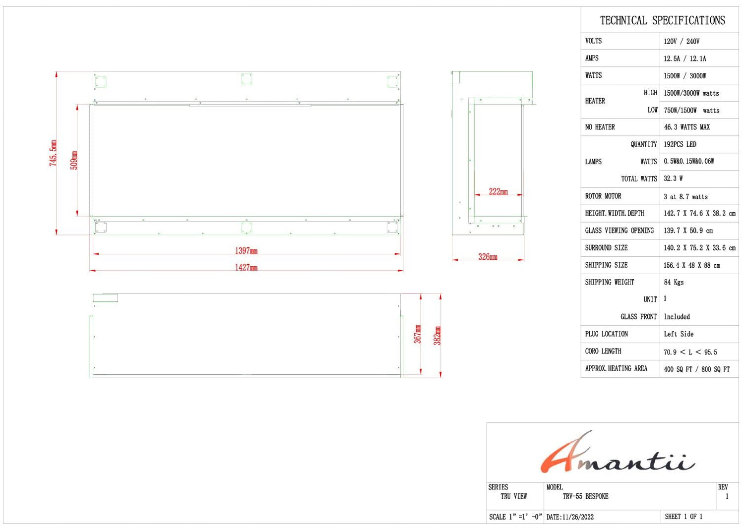 Amantii TRV-55-BESPOKE Tru View Bespoke - 55" Indoor / Outdoor 3 Sided Electric Fireplace Featuring a 20" Height, WiFi Compatibility, Bluetooth Connectivity, Multi Function Remote, and a Selection of Media Options