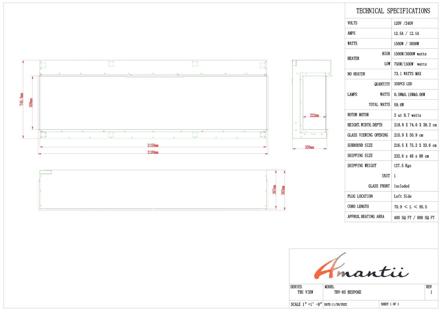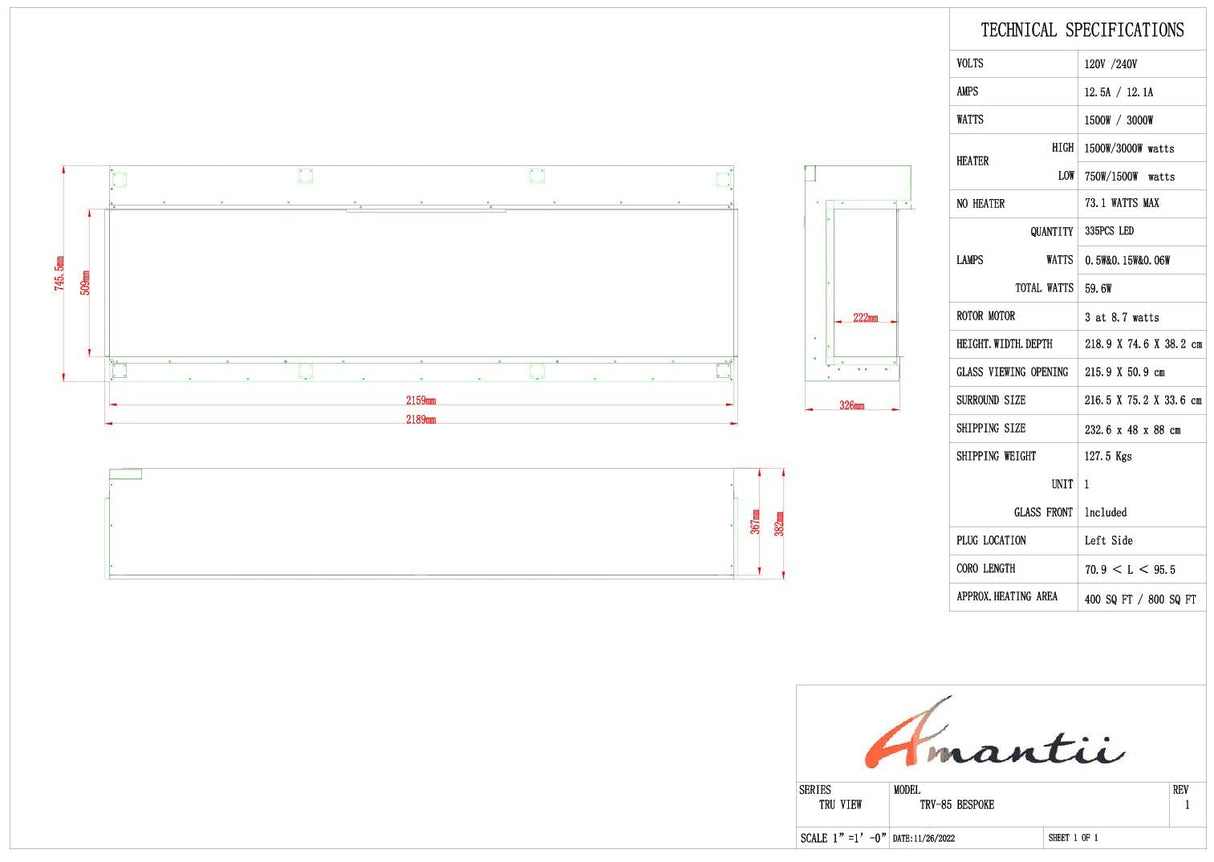 Amantii TRV-85-BESPOKE Tru View Bespoke - 85" Indoor / Outdoor 3 Sided Electric Fireplace Featuring a 20" Height, WiFi Compatibility, Bluetooth Connectivity, Multi Function Remote, and a Selection of Media Options