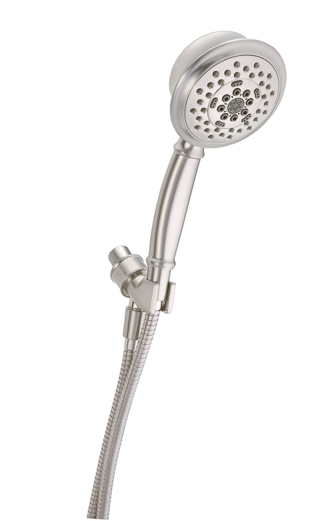 DescriptionProduct DescriptionDanze D461024BN surge showerarm mount kit with 5-function showerhead, 2.0 gpm, brushed nickel. 5-Function Handshower: wide, centerjet, aeration, massage and wide + centerjet. Showerarm mount with brass ball joint and integral check valve (dual valve™ technology). 2.0 gpm (7.6 L/min) maximum flow rate at 20-80 psi. 72-Inch metal hose. Meets CEC (California energy Commission) requirement. Whether you’re building a new home or simply remodeling, Danze has numerous home décor collections to choose from. Danze is an entrepreneurial company who believes that style and design have the power to transform any décor! Danze products are manufactured using the highest quality materials for precise fit, finish, and dependability. Danze emphasis is on creating products that are an expression of our customers and their relentless search for something beautiful, distinctive, and refreshing. At Danze, you’ll receive superior service, selection and supportFrom the ManufacturerFor nearly 20 years, the kitchen and bath industry has known Danze as a leader in product design and beautiful styling. What industry professionals and homeowners may not have known is that Danze has a sister company, Gerber - an 85-year-old manufacturer of some of the highest performing, most reliable products on the market. To best meet the diverse and ever-changing needs of home products, Danze has transformed to be Danze by Gerber, a perfect blend of the handcrafted, trusted performance of Gerber on the inside and beautiful design on the outside. The Danze by Gerber product combination can be found in a range of kitchen and bath faucets, bath accessories and shower systems. A thoughtful balance of form and function. Inspired, beautiful design on the outside. Handcrafted, trusted performance on the inside. A combination that results in true value and commitment. You can call it a breath of fresh air. We call it Danze by Gerber. Product Information Product Overview Connection Type: 1/2 -14npsm ConnectionFlow Rate: 2.0gpm Max Flow Rate @ 80 psiSpray/Stream Function: 5 Functions: Wide Aeration Centerjet Massage and Wide + CenterjetBrand: Gerber Features Brass Ball JointDual Valve Technology: Features Dual Valve technology which minimizes water pressure loss as setting changesEasy Clean Nozzles: Features Easy Clean Soft-Touch NozzlesEasy-Glide Selector Ring: Features Easy-Glide selector ring for effortless smooth adjustmentIntegral Check Valve: Includes Integral Check Valves in Handshower & Supply MountWarranty: Limited lifetime Description Powerful yet light weight handshower kits provide extra functionality and include mounting hardware for a convenient installation. Components Hose Type: Includes Durable 72 All-Metal Interlock Shower Hose with Brass ConicalsIncludes: Handshower & Shower Hose Shower Arm Mount