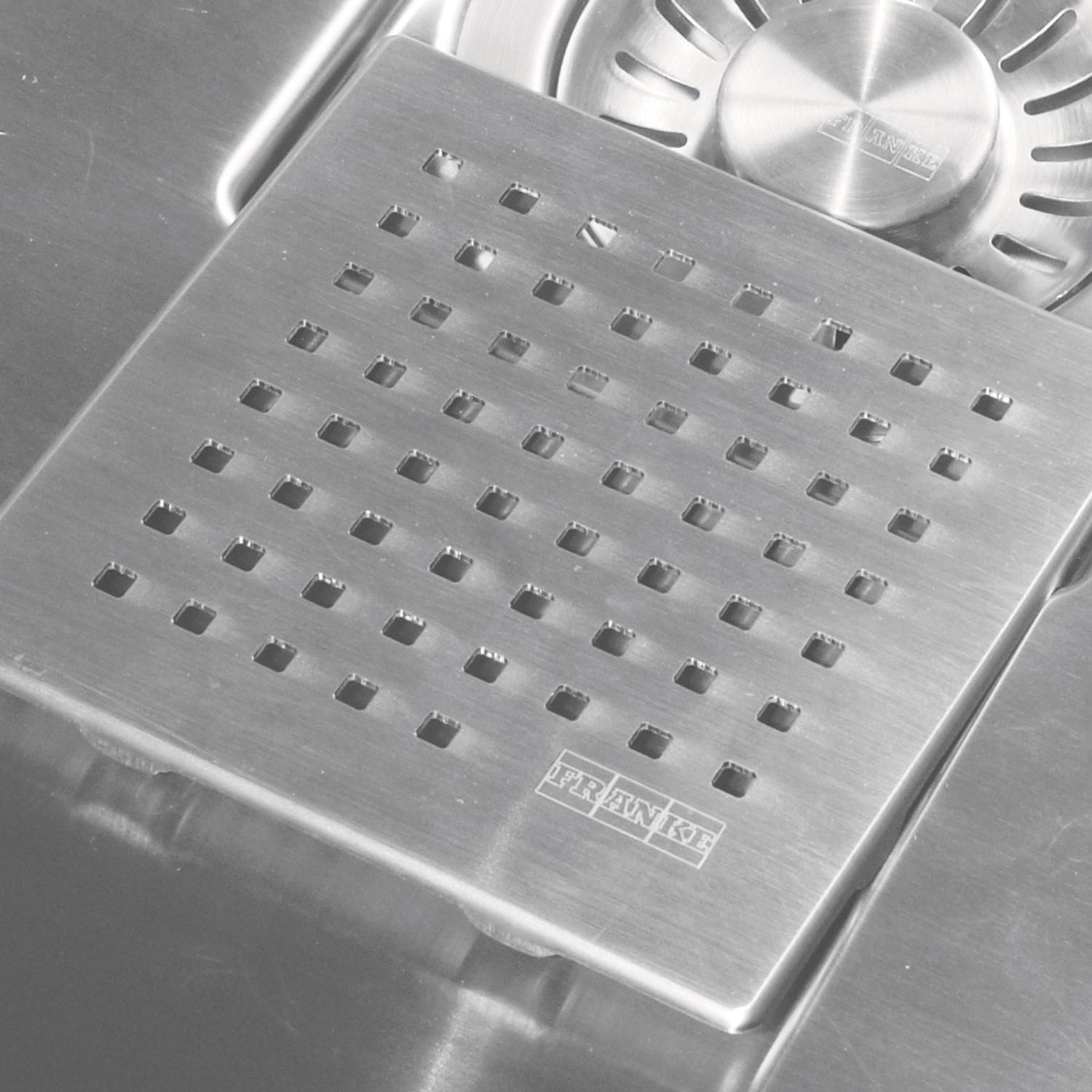 This stainless steel removable drain cover conceals the drain for a seamless bowl surface, while providing a flat bottom surface to allow for more usable workspace. The drain, strainer and waste disposer are hidden to maintain the elegant design of your Franke sink.