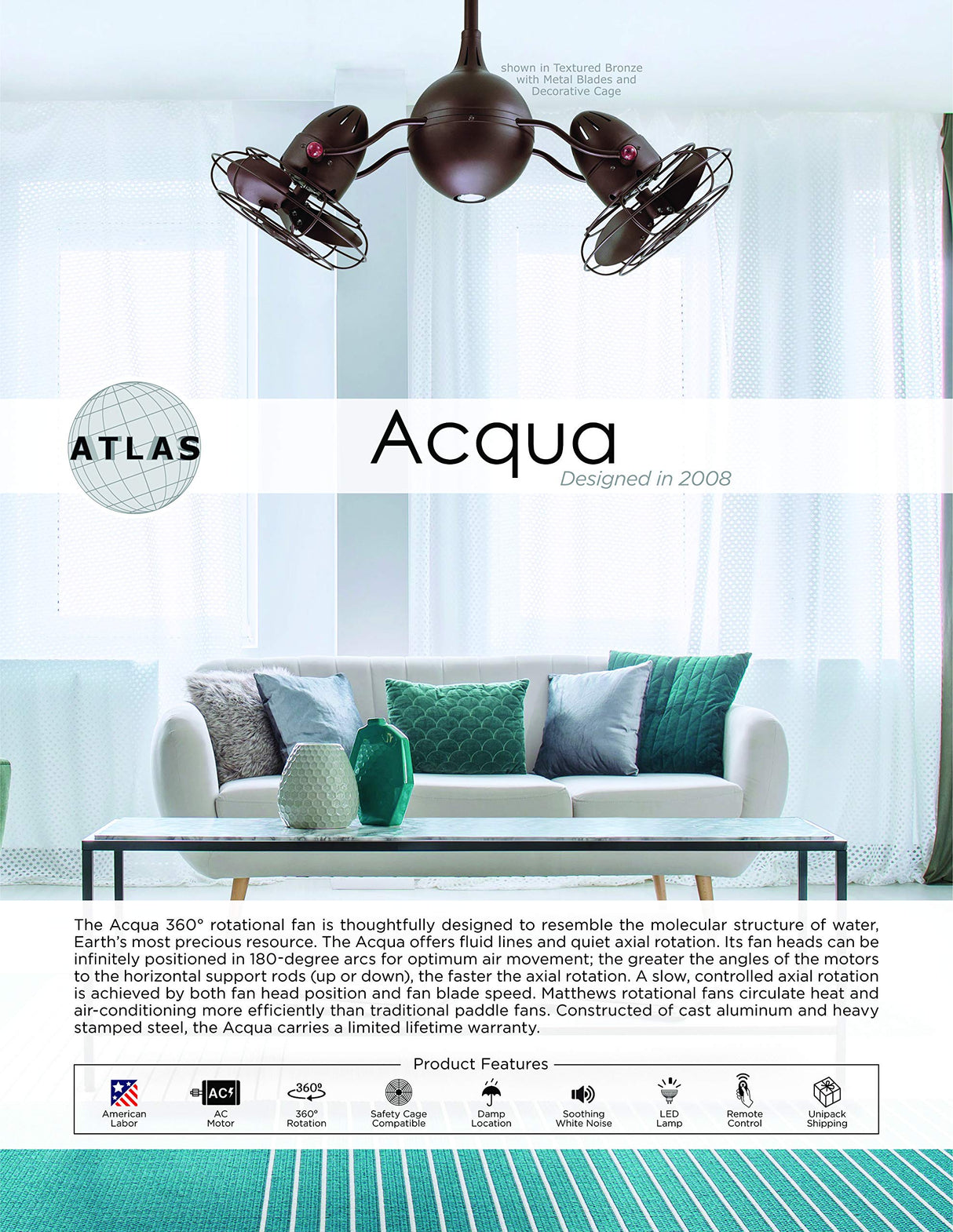 The Acqua 360° rotational fan is thoughtfully designed to resemble the molecular structure of water, Earth’s most precious resource. The Acqua offers fluid lines and quiet axial rotation. Its fan heads can be infinitely positioned in 180-degree arcs for optimum air movement; the greater the angles of the motors to the horizontal support rods (up or down), the faster the axial rotation. A slow, controlled axial rotation is achieved by both fan head position and fan blade speed. Matthews rotational fans circulate heat and air-conditioning more efficiently than traditional paddle fans. Constructed of cast aluminum and heavy stamped steel, the Acqua carries a limited lifetime warranty.