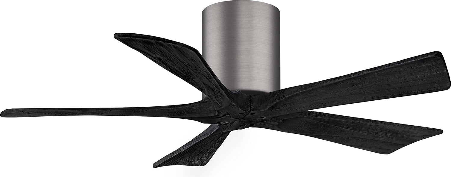 Matthews Fan IR5H-BP-BK-42 Irene-5H five-blade flush mount paddle fan in Brushed Pewter finish with 42” solid matte black wood blades.